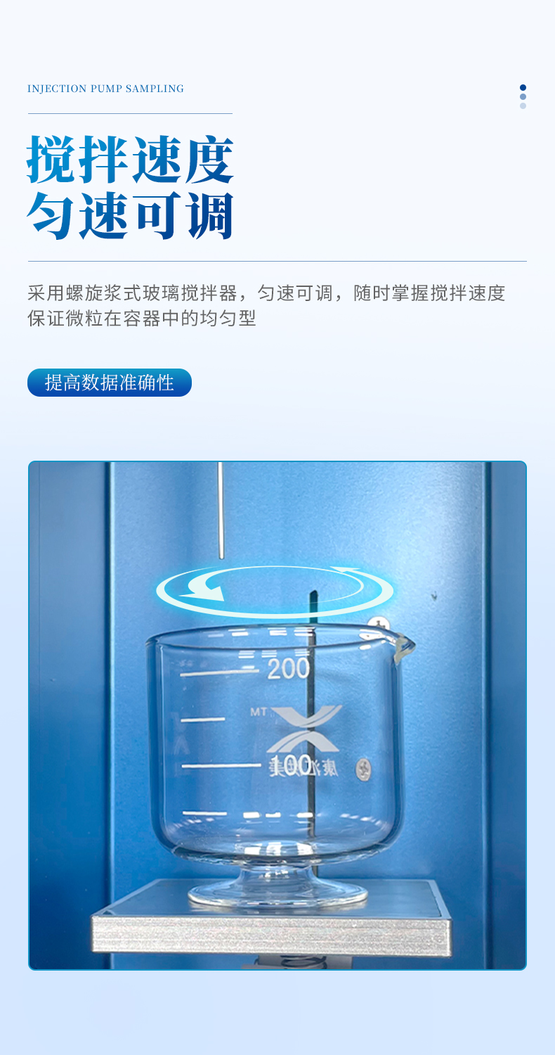 ●采用螺旋漿式玻璃攪拌器,勻速可調(diào),隨時(shí)掌握攪拌速度,保證微粒在容器中的均勻型。提高數(shù)據(jù)準(zhǔn)確性。