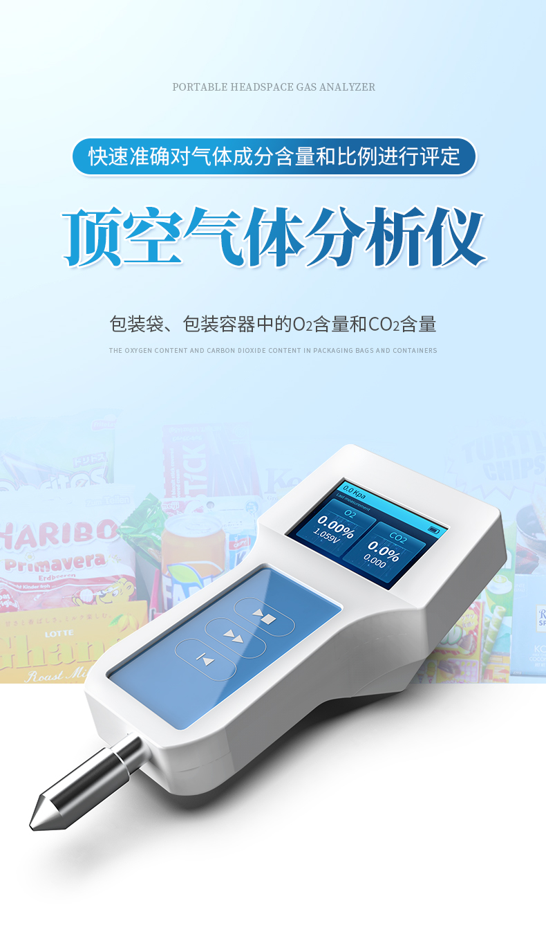 1.包裝袋:適用于咖啡、奶酪、奶茶、奶粉、面包、豆粉、氣調(diào)包裝、即食食品、藥品等各種非負(fù)壓包裝袋內(nèi)氣體中的O2含量和CO2含量的測(cè)試;