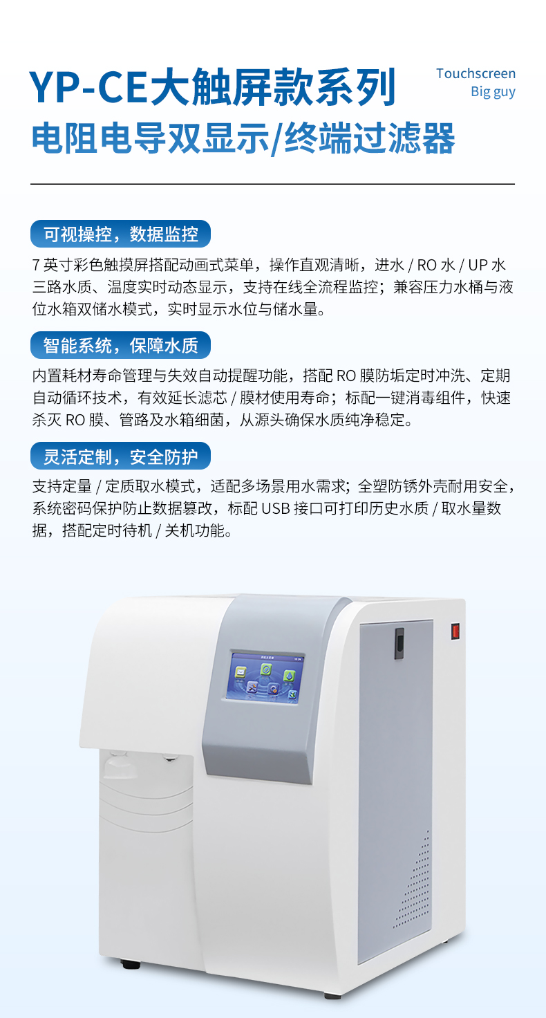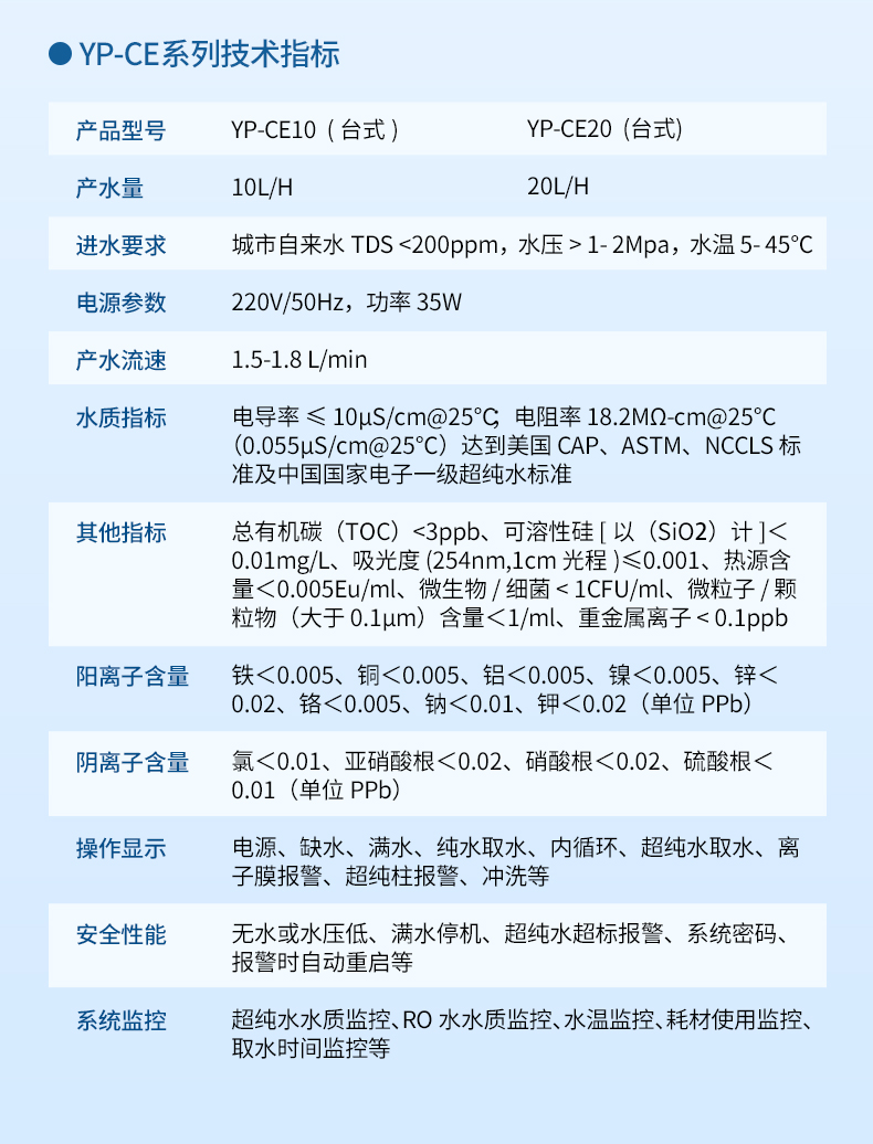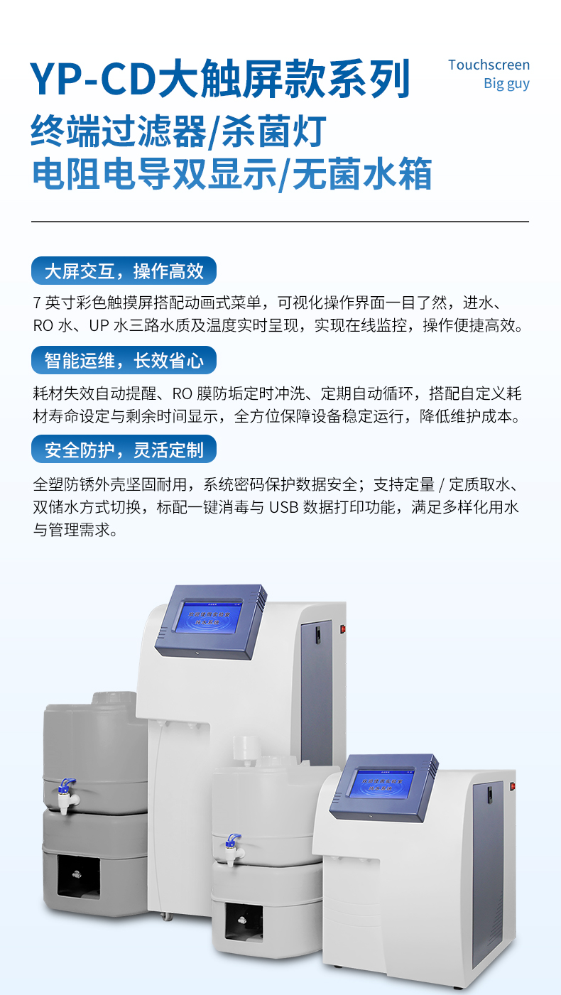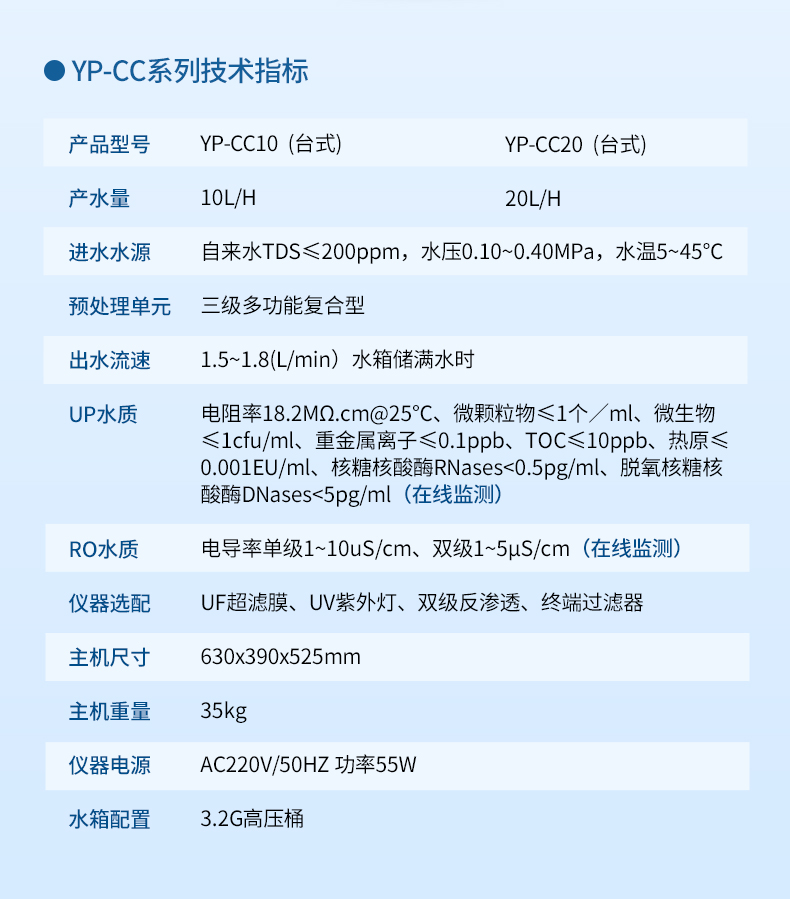 UP出水水質:電阻率18.2MΩ.cm@25℃(在線監測)微顆粒物≤1個/ml,微生物≤1cfu/ml重金屬離子≤0.1ppb,TOC≤10ppb熱原≤0.001EU/ml,核糖核酸酶RNases<0.5pg/ml脫氧核糖核酸酶DNases<5pg/ml