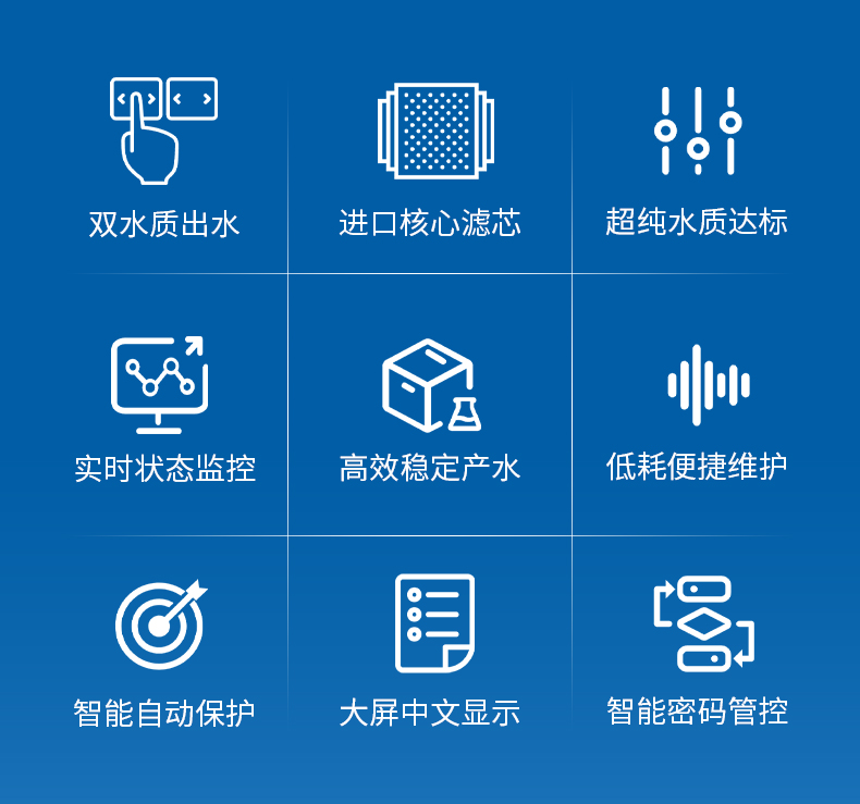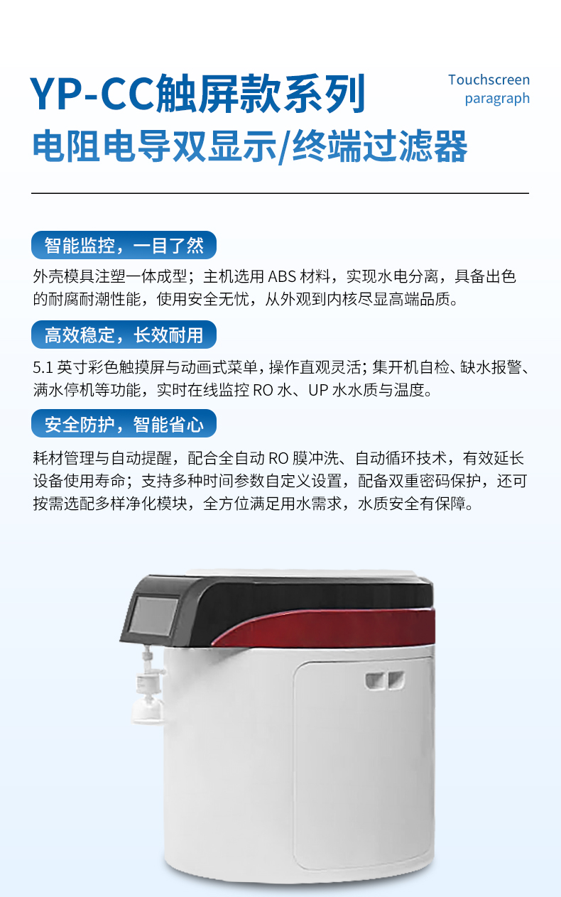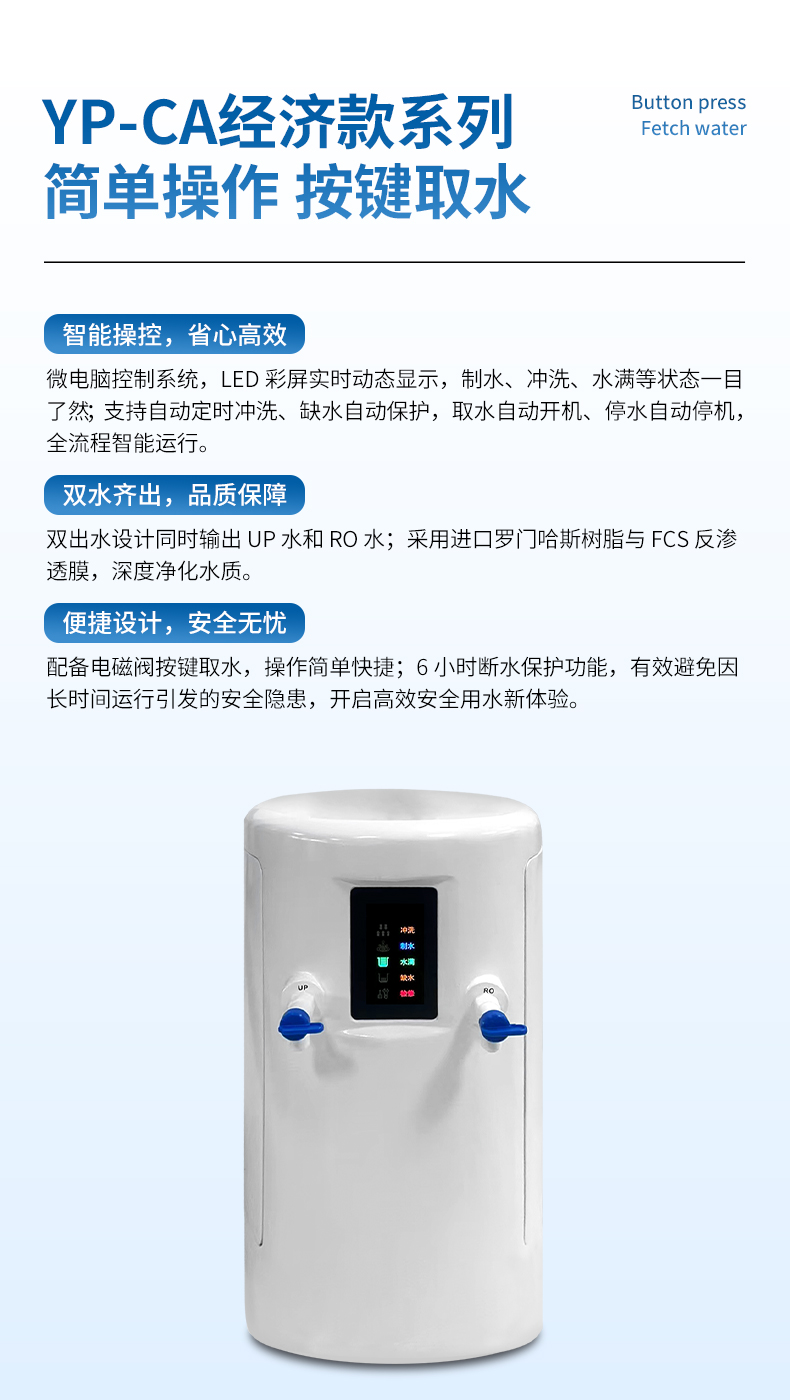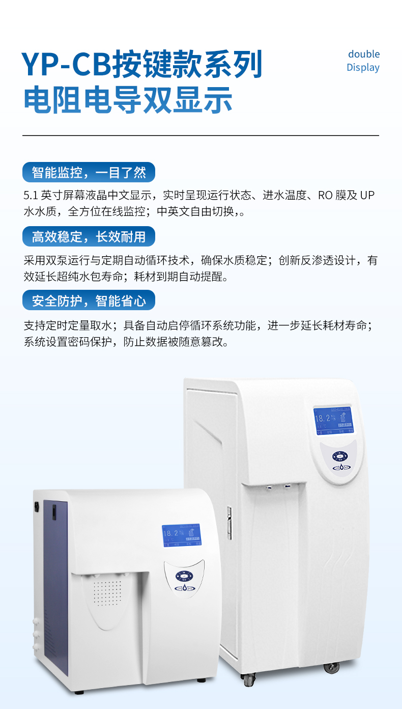 UP出水水質:電阻率18.2MΩ.cm@25℃(在線監測)微顆粒物≤1個/ml,微生物≤1cfu/ml重金屬離子≤0.1ppb,TOC≤10ppb熱原≤0.001EU/ml,核糖核酸酶RNases<0.5pg/ml脫氧核糖核酸酶DNases<5pg/ml