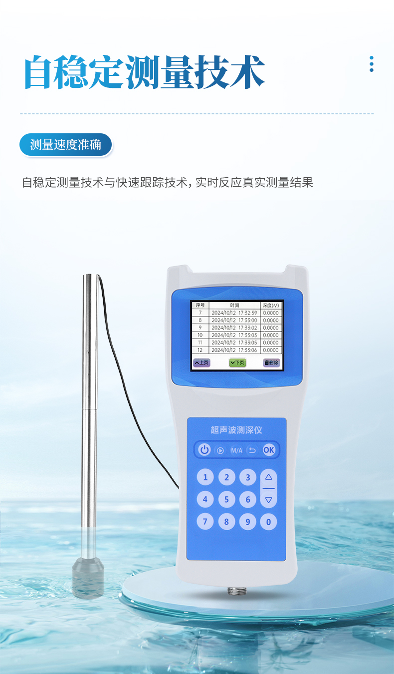 超聲波測深儀是測量水庫、湖泊、江河、淺海等水體的便攜式測深儀,測深時將超聲波換能器置于水面或一定位置,利用超聲波在水中的固定聲速VC和超聲波發射到接收的時間T,儀器自動換算出水深H。本品是我司積多年生產經驗,吸取了多種同類產品優點,而開發的一款方便適用的手持式超聲波測距儀表。超聲波收發轉換電路采用專用大規模集成電路,元件貼片率99%,并以液晶顯示測深結果,保證了產品的長期可靠性,同時將其功耗降到了極低。具有測量精確、耗電省、可靠性高、使用方便、操作簡單、測量速度準確、攜帶方便等優點。儀器可在靜水中測深,也可在具有一定速度的水中測深;水流速度可達5m/秒左右,是水文測驗、水電廠庫區、湖泊、河道勘測和環境水域監測的理想水深測量儀器。