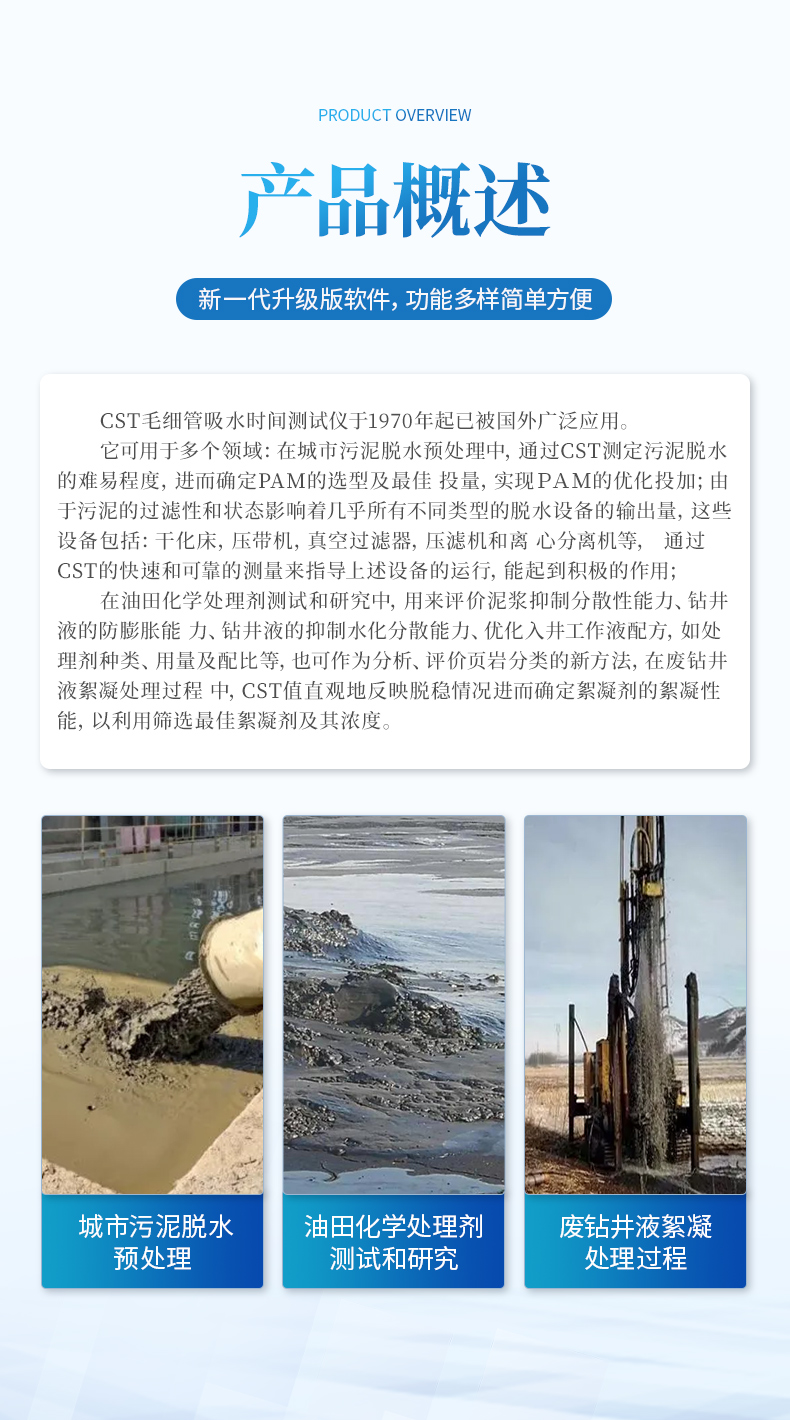 CST毛細(xì)管吸水時(shí)間測(cè)試儀(Capillary Suction Time)于1970年起已被國(guó)外廣泛應(yīng)用,它可用于多個(gè)領(lǐng)域:在城市污泥脫水預(yù)處理中,通過(guò)CST測(cè)定污泥脫水的難易程度,進(jìn)而確定PAM的選型及最佳 投量,實(shí)現(xiàn)PAM的優(yōu)化投加;由于污泥的過(guò)濾性和狀態(tài)影響著幾乎所有不同類型的脫水設(shè)備的輸出量,這些設(shè)備包括:干化床,壓帶機(jī),真空過(guò)濾器,壓濾機(jī)和離 心分離機(jī)等, 通過(guò)CST的快速和可靠的測(cè)量來(lái)指導(dǎo)上述設(shè)備的運(yùn)行,能起到積極的作用;在油田化學(xué)處理劑測(cè)試和研究中,用來(lái)評(píng)價(jià)泥漿抑制分散性能力、鉆井液的防膨脹能 力、鉆井液的抑制水化分散能力、優(yōu)化入井工作液配方,如處理劑種類、用量及配比等,也可作為分析、評(píng)價(jià)頁(yè)巖分類的新方法,在廢鉆井液絮凝處理過(guò)程 中,CST值直觀地反映脫穩(wěn)情況進(jìn)而確定絮凝劑的絮凝性能,以利用篩選最佳絮凝劑及其濃度。