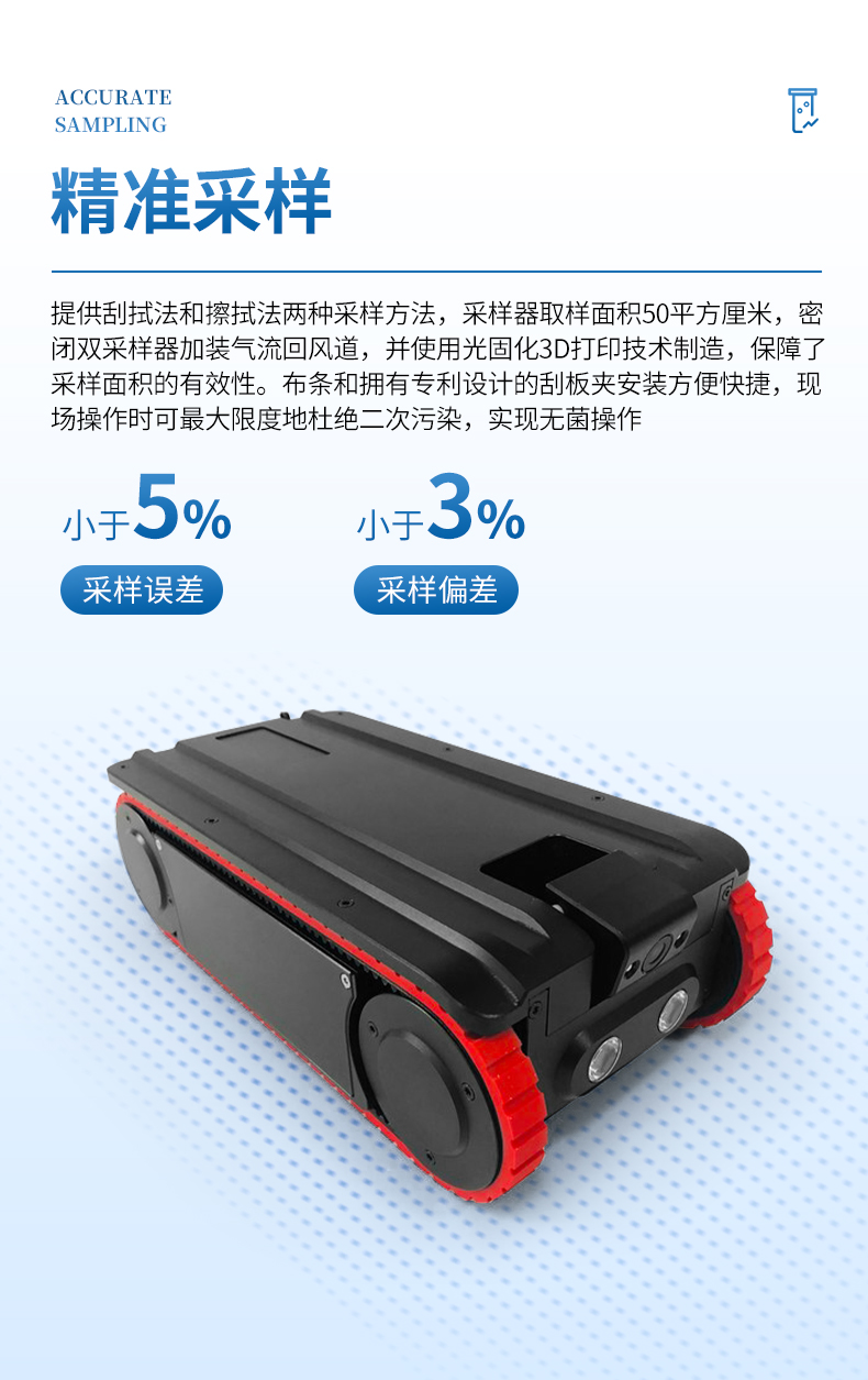 精準(zhǔn)采樣:提供刮拭法和擦拭法兩種采樣方法,采樣器取樣面積50平方厘米,密閉雙采樣器加裝氣流回風(fēng)道,并使用光固化3D打印技術(shù)制造,保障了采樣面積的有效性。布條和擁有專(zhuān)利設(shè)計(jì)的刮板夾安裝方便快捷,現(xiàn)場(chǎng)操作時(shí)可最大限度地杜絕二次污染,實(shí)現(xiàn)無(wú)菌操作。采樣誤差小于5%,采樣偏差小于3%。