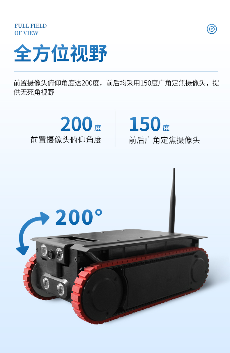 全方位視野:前置攝像頭俯仰角度達(dá)200度,前后均采用150度廣角定焦攝像頭,提供無(wú)死角視野。