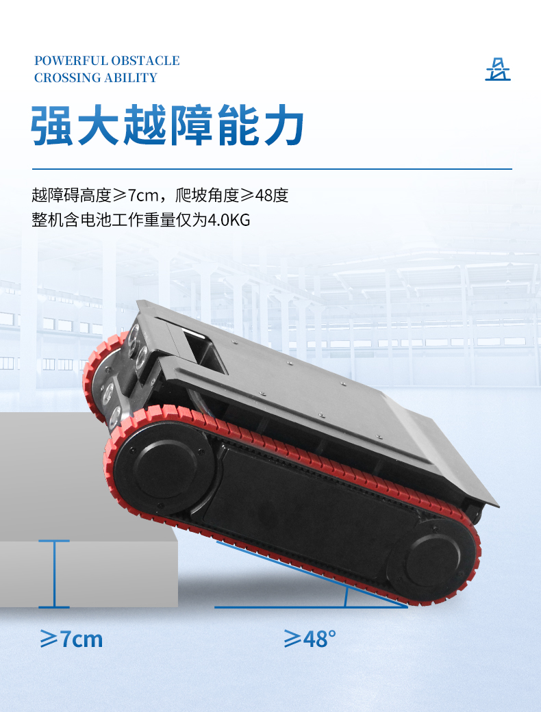 強(qiáng)大越障能力:越障礙高度≥7cm,爬坡角度≥48度,整機(jī)含電池工作重量?jī)H為4.0KG。