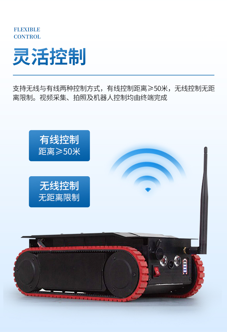 靈活控制:支持無(wú)線與有線兩種控制方式,有線控制距離≥50米,無(wú)線控制無(wú)距離限制。視頻采集、拍照及機(jī)器人控制均由終端完成。