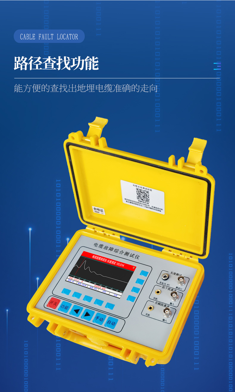 2、抗干擾通道:采用高性能濾波抗工頻干擾電路,斷電狀態下配合信號發生器定位直埋電纜對地漏電位置,測地埋電纜路徑走向及深度。