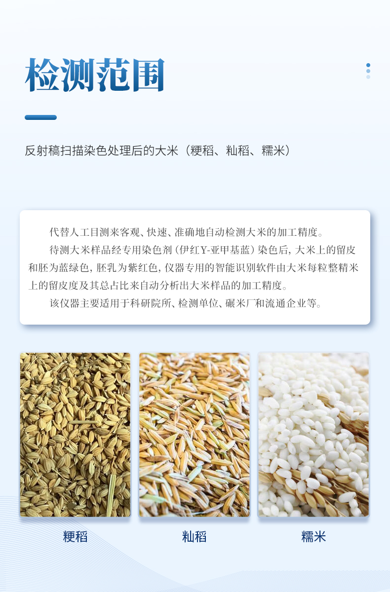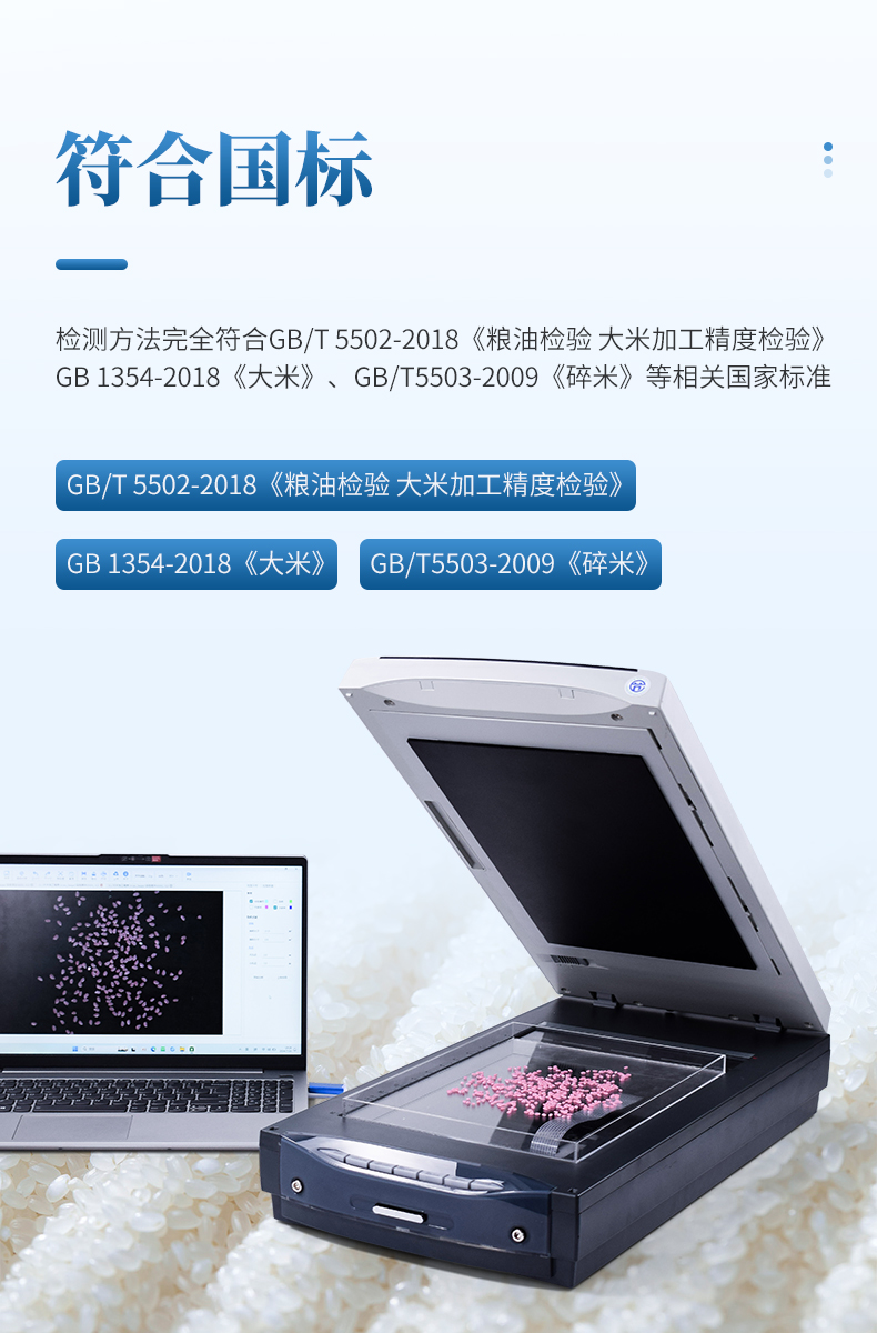 3、檢測方法完全符合GB/T 5502-2018《糧油檢驗 大米加工精度檢驗》、GB 1354-2018《大米》、GB/T5503-2009《碎米》等相關(guān)國家標準。