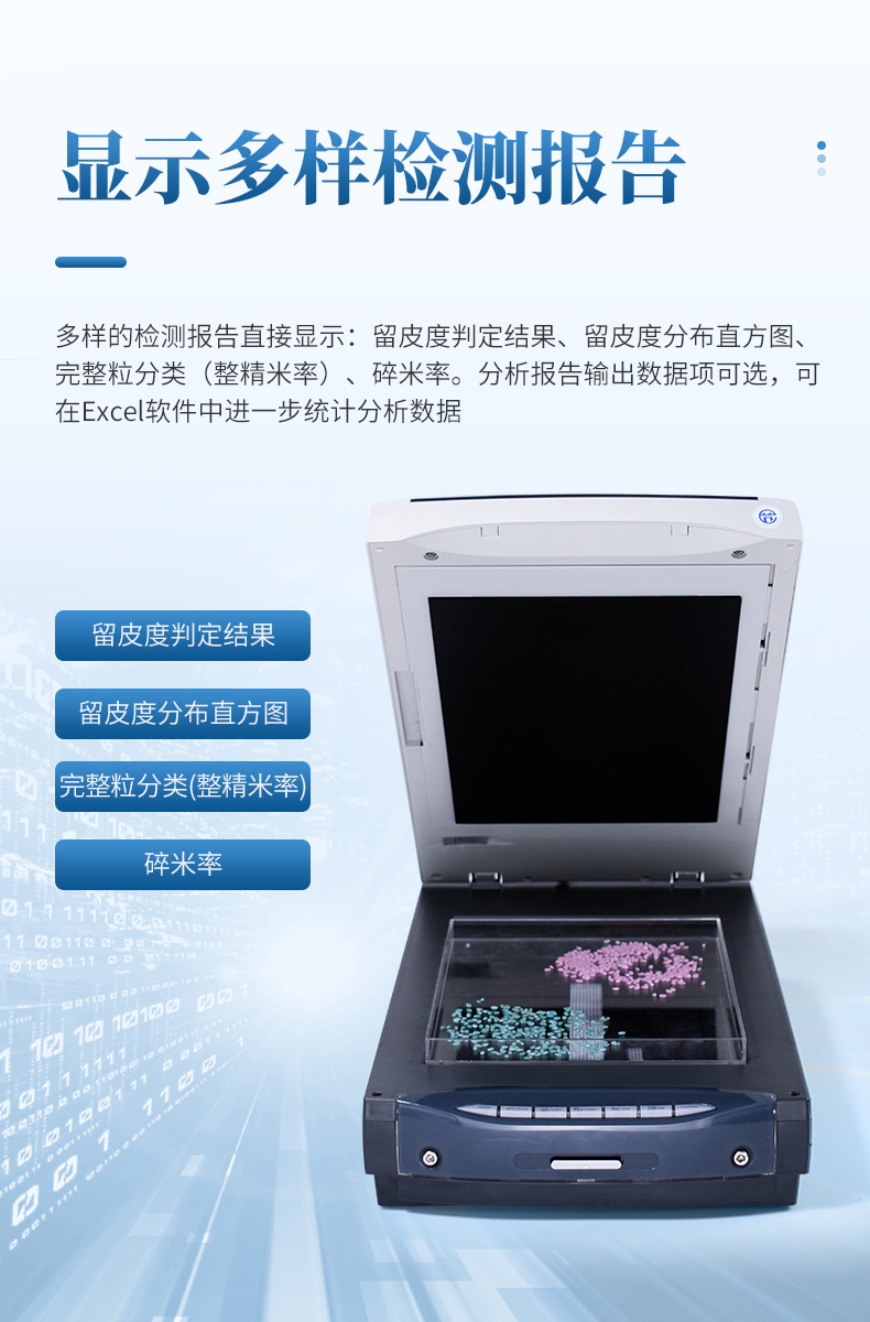6、多樣的檢測報告直接顯示:留皮度判定結(jié)果、留皮度分布直方圖、完整粒分類(整精米率)、碎米率。分析報告輸出數(shù)據(jù)項可選,可在Excel軟件中進一步統(tǒng)計分析數(shù)據(jù)。