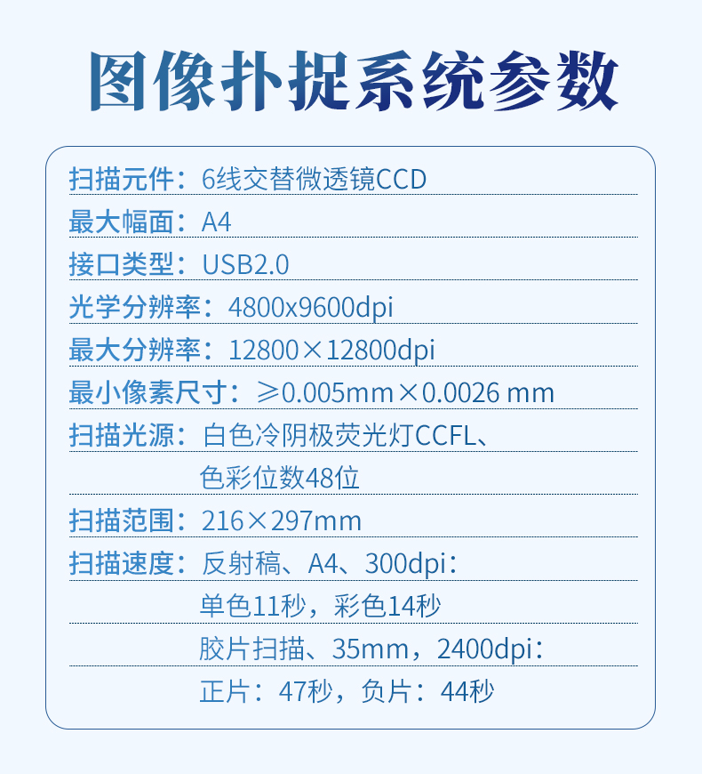 1、配光學分辨率4800×9600、A4加長的雙光源彩色掃描儀。反射稿幅面為355.6mm×215.9mm,透掃幅面為320.0mm×203.2mm,最小像素尺寸0.005mm×0.0026 mm。