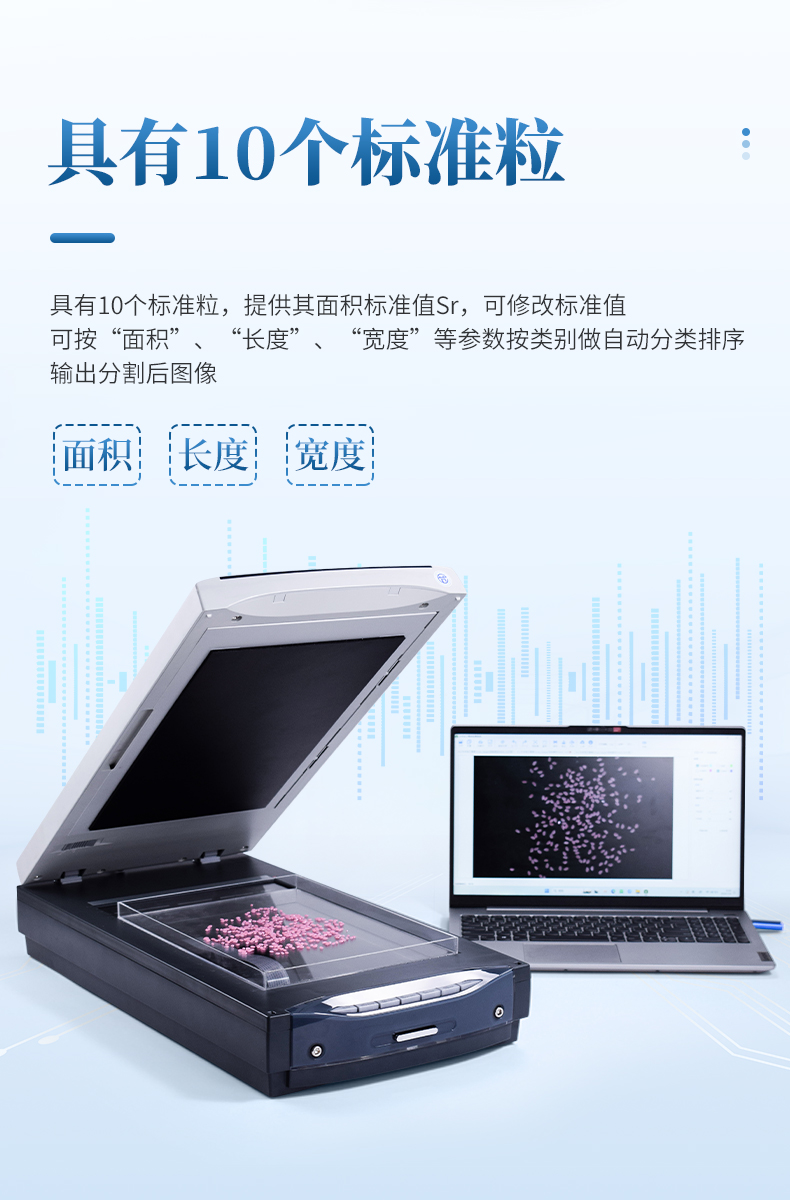 用于代替人工目測來客觀、快速、準確地自動檢測大米的加工精度。待測大米樣品經(jīng)專用染色劑(伊紅Y-亞甲基藍)染色后,大米上的留皮和胚為藍綠色,胚乳為紫紅色,儀器專用的智能識別軟件由大米每粒整精米上的留皮度及其總占比來自動分析出大米樣品的加工精度。該儀器主要適用于科研院所、檢測單位、碾米廠和流通企業(yè)等。