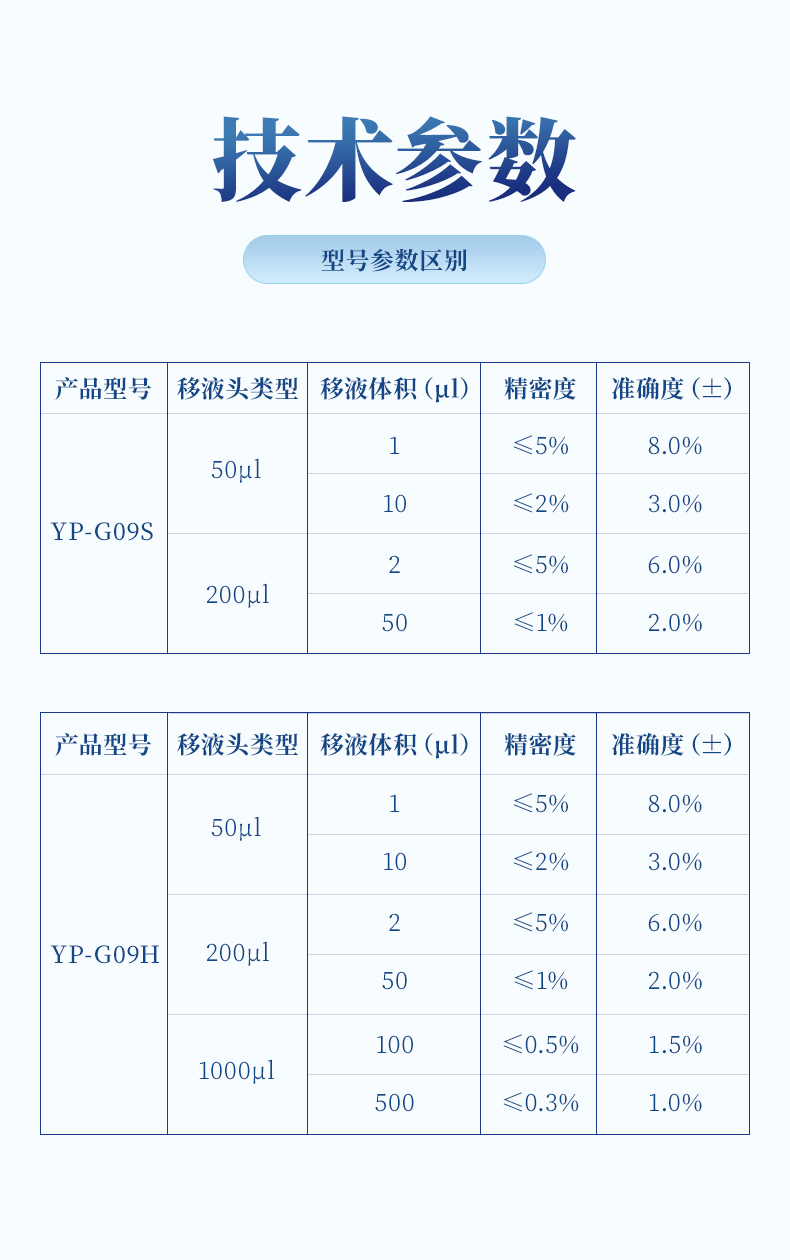 移液頭類型 | 移液體積(μl) | 精密度 | 準確度(±) | 備注 |