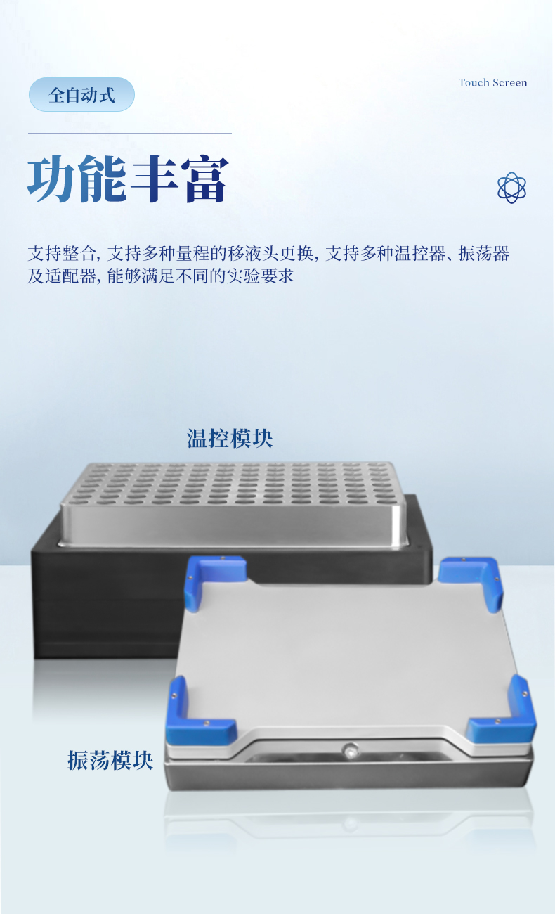 功能豐富:支持整合,支持多種量程的移液頭更換,支持多種溫控器、振蕩器及適配器,能夠滿足不同的實驗要求。