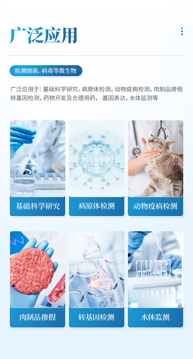 儀器采用通用100uLPCR反應管,降低耗材成本且易于獲得。廣泛應用于:基礎科學研究,病原體檢測,動物疫病檢測,肉制品摻假,轉基因檢測,藥物開發及合理用藥, 基因表達,水體監測等