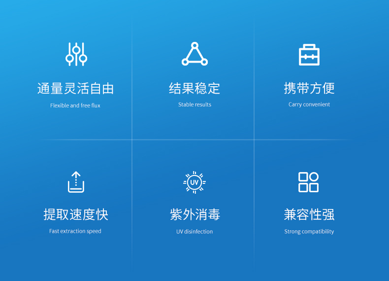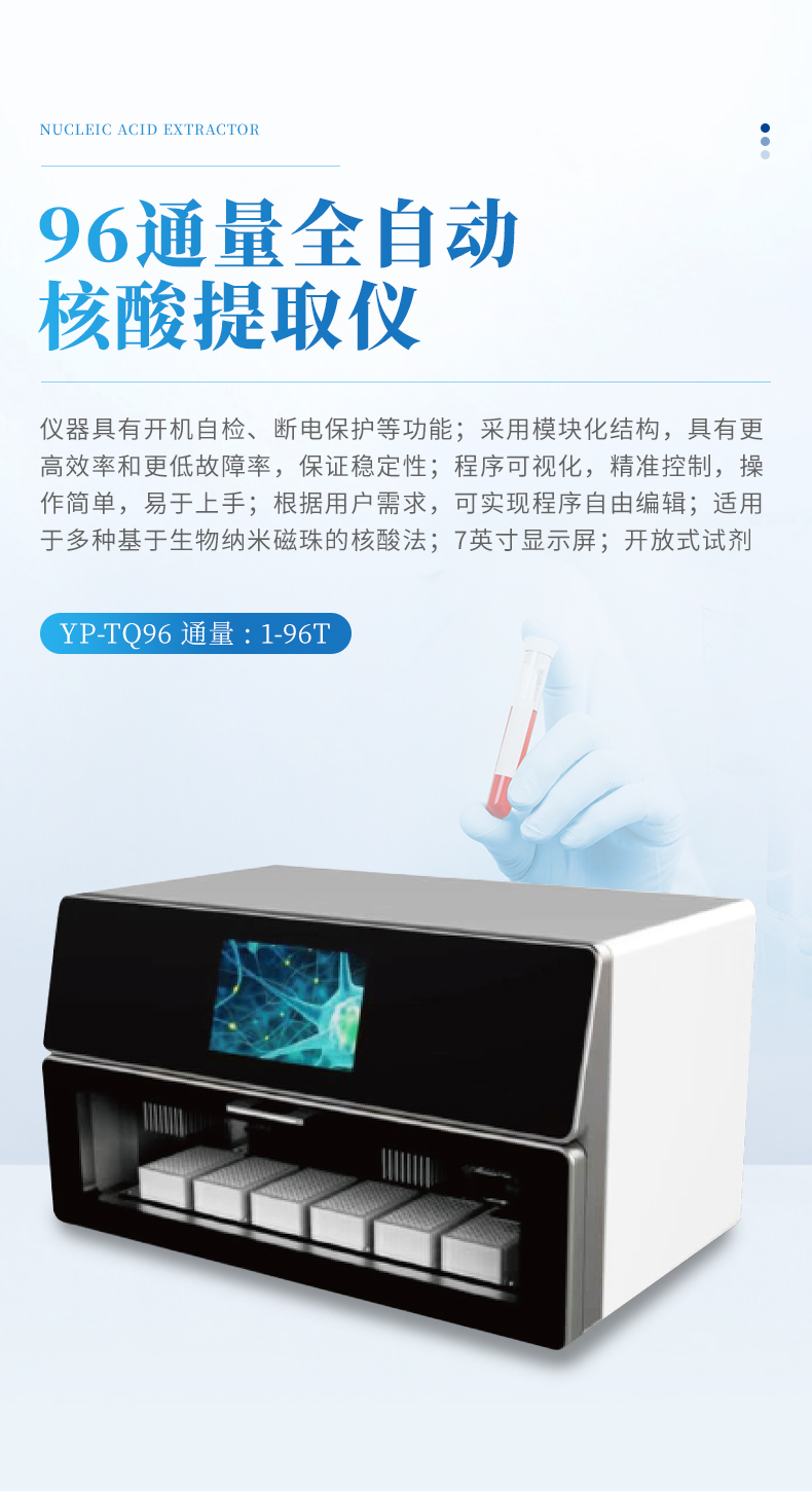 核酸提取儀通過磁珠法提取核酸,選擇相應的試劑盒就可以自動的從多種樣品材料如血液、組織、細胞中分離純化高純度的核酸。具有兼容性強(適配預封裝提取試劑盒,也可適配單頭份試劑)、提取速度快、提取回收率高、操作簡便的優(yōu)點,是分子生物學實驗室檢測試驗的得力“助手”。可廣泛應用于科學研究、分子診斷、動植物疫病檢測等領域。