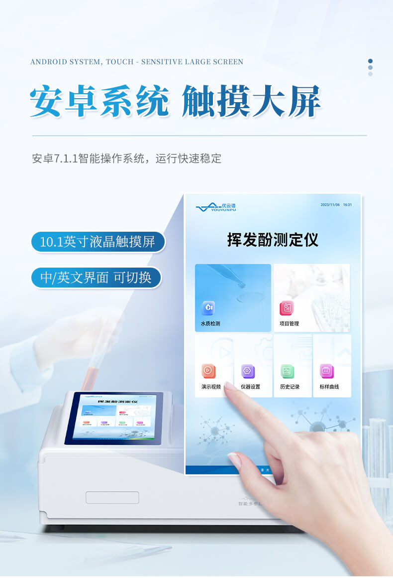 本儀器主要檢測水質揮發性酚含量指標,兼具智能數據分析功能,圖表、列表顯示數據,分析一目了然;高清晰度彩色液晶觸摸顯示屏,Android智能操作系統,中文顯示界面,中英文鍵盤,人性化操作,使用更簡單。