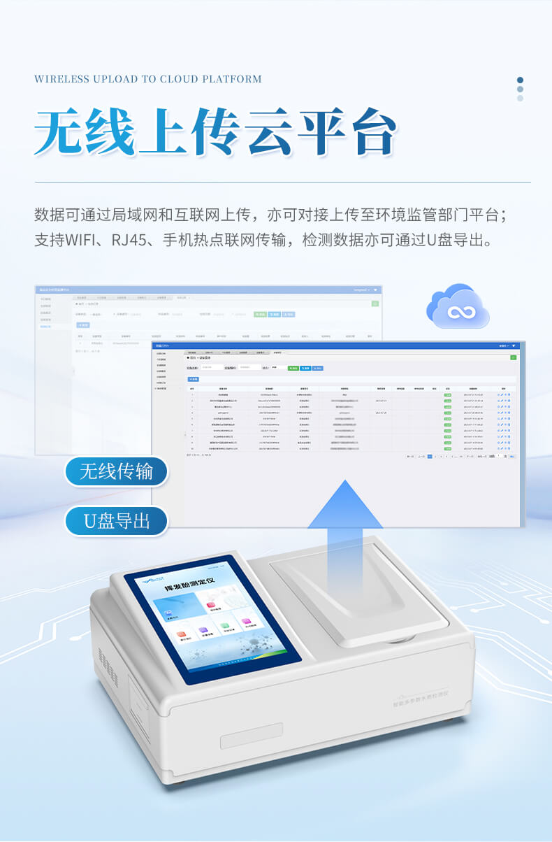 云平臺:儀器帶有監管平臺,連接有線/無線網絡,檢測結果直接傳輸至環境安全監管平臺;