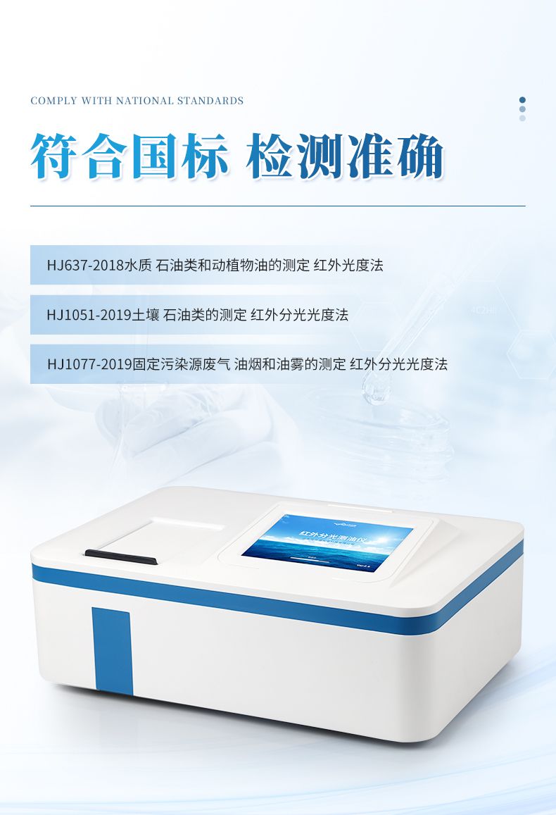 紅外分光測(cè)油儀是根據(jù)中國(guó)環(huán)境保護(hù)標(biāo)準(zhǔn)《HJ637-2018水質(zhì)石油類和動(dòng)植物油的測(cè)定 紅外分光光度法》、《HJ1051-2019土壤石油類的測(cè)定 紅外分光光度法》、《HJ1077-2019固定污染源廢氣 油煙和油霧的測(cè)定 紅外分光光度法》進(jìn)行研發(fā)制造,該儀器主要檢測(cè)地表水、地下水、工業(yè)廢水、土壤、固定污染源廢氣、油煙和油霧中含油量測(cè)定的專用紅外光譜分析儀器。