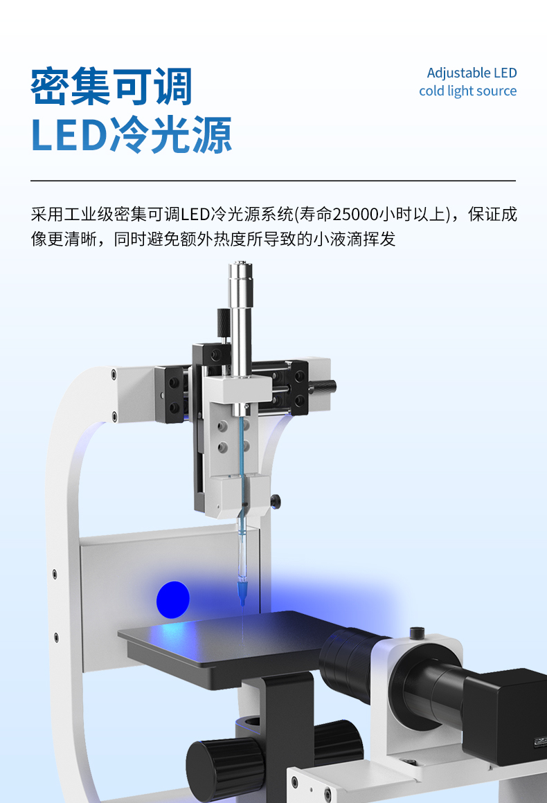 3. 采用工業級密集可調LED冷光源系統(壽命25000H以上),保證成像更清晰,同時避免額外熱度所導致的小液滴揮發;