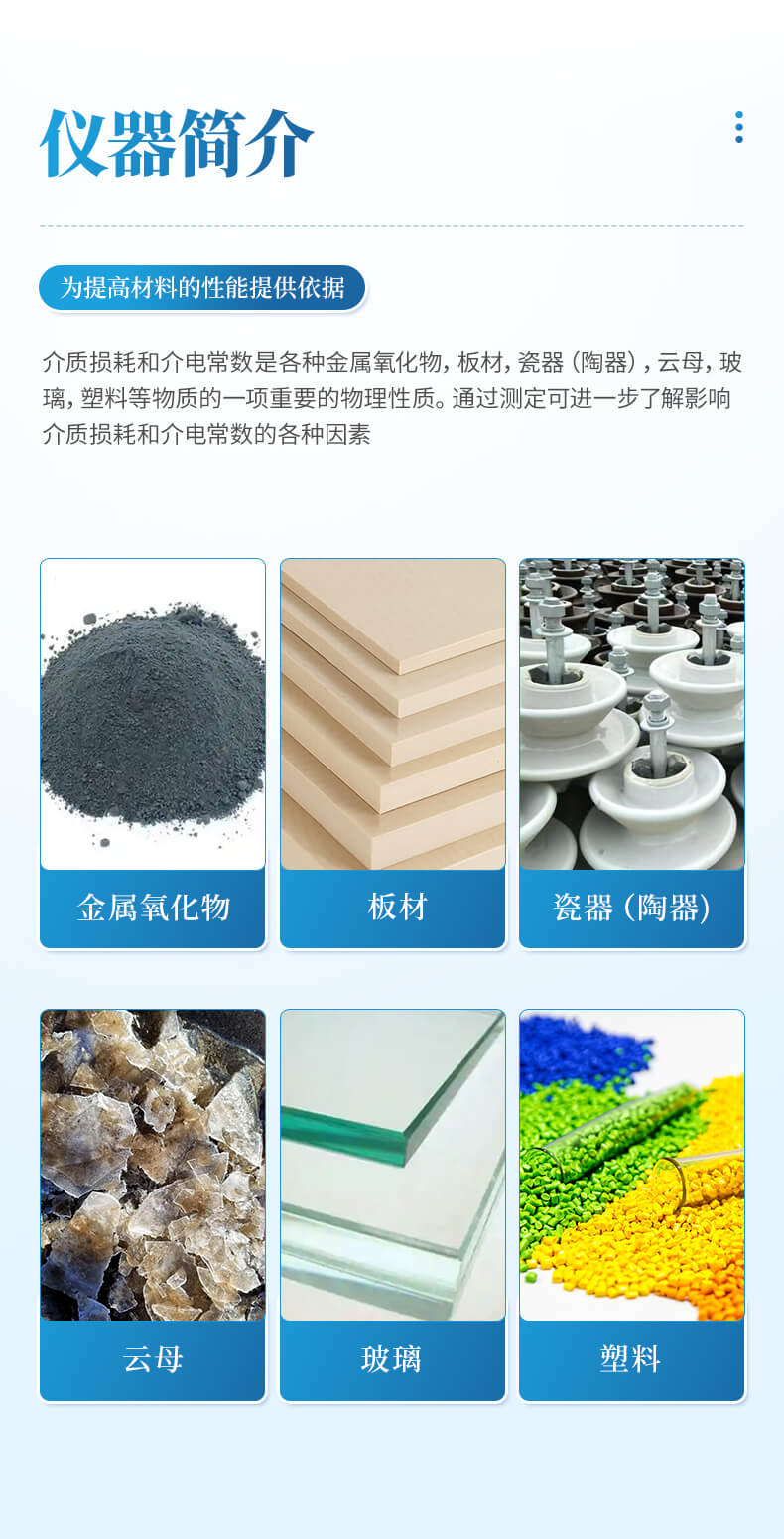 介質損耗和介電常數是各種金屬氧化物,板材,瓷器(陶器),云母,玻璃,塑料等物質的一項重要的物理性質。通過測定可進一步了解影響介質損耗和介電常數的各種因素,為提高材料的性能提供依據。