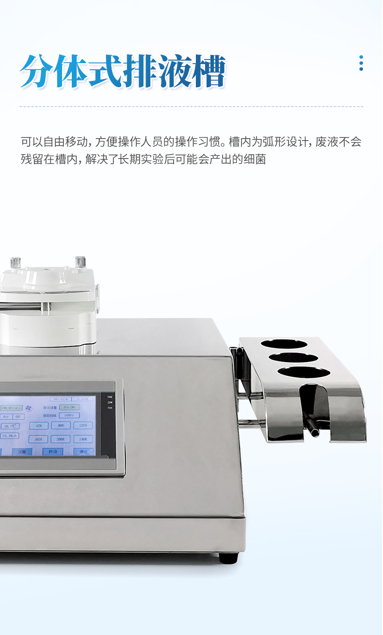 3、分體式的排液槽設計:可以自由移動,方便操作人員的操作習慣。槽內為弧形設計,廢液不會殘留在槽內,解決了長期實驗后可能會產出的細菌。