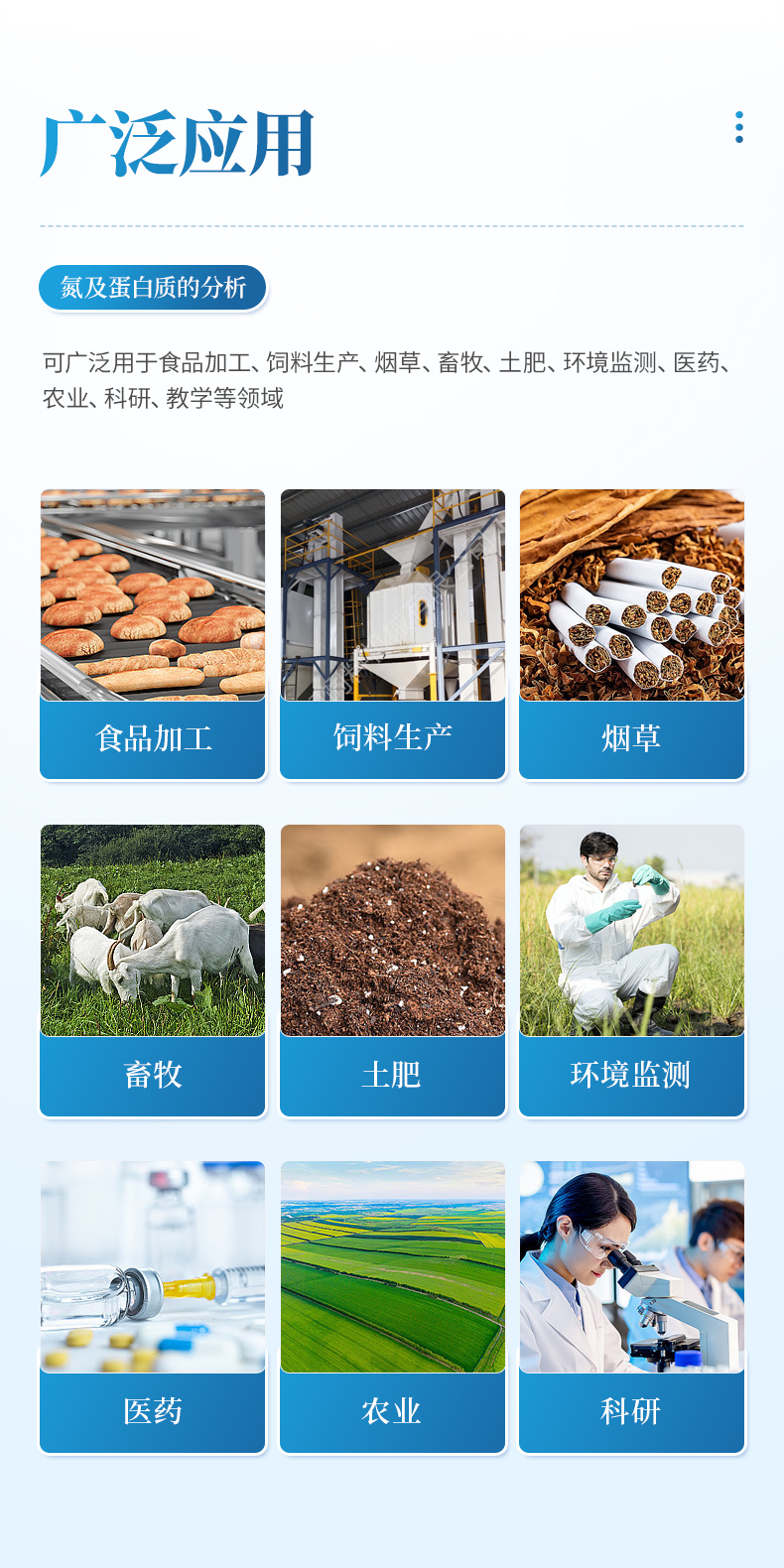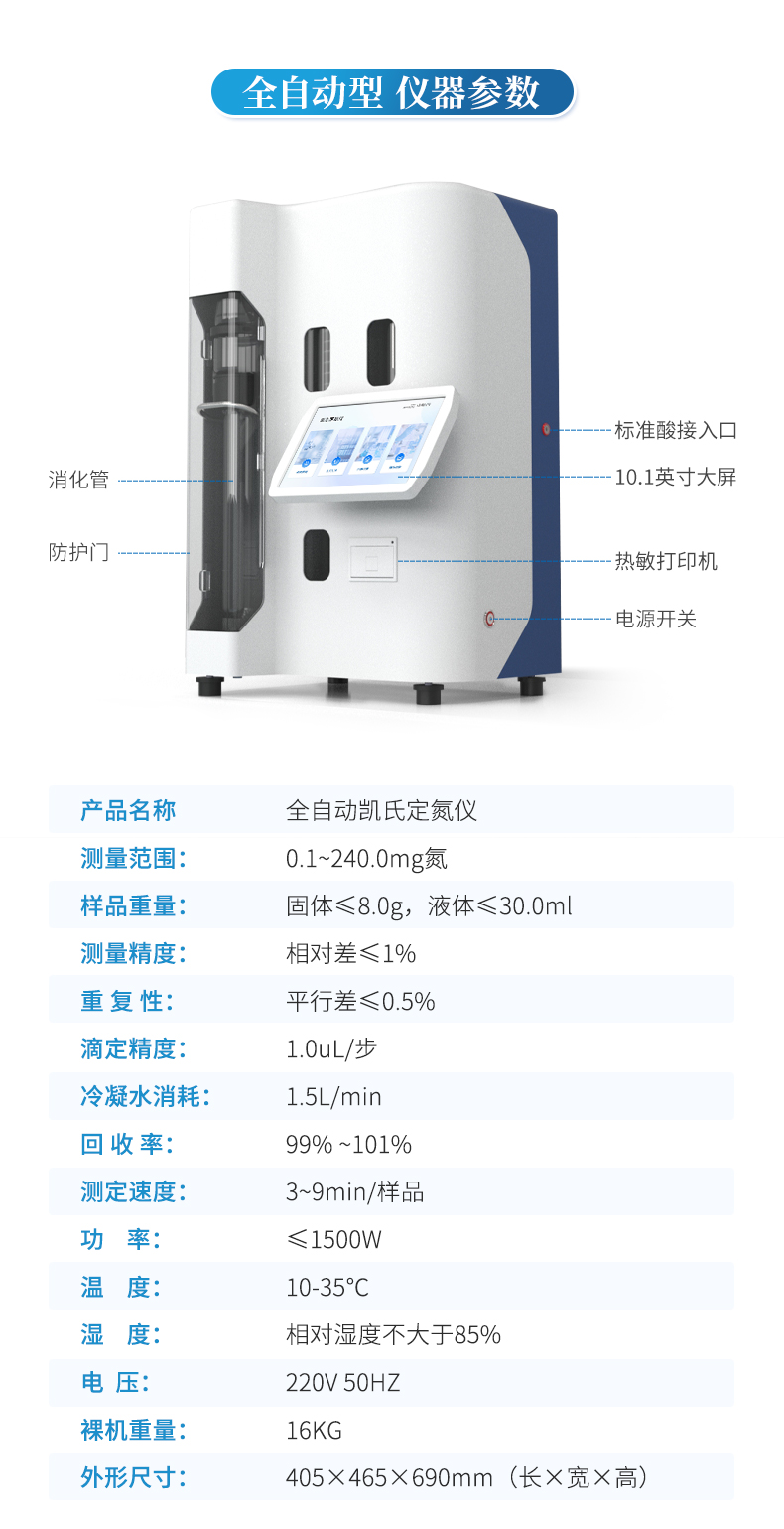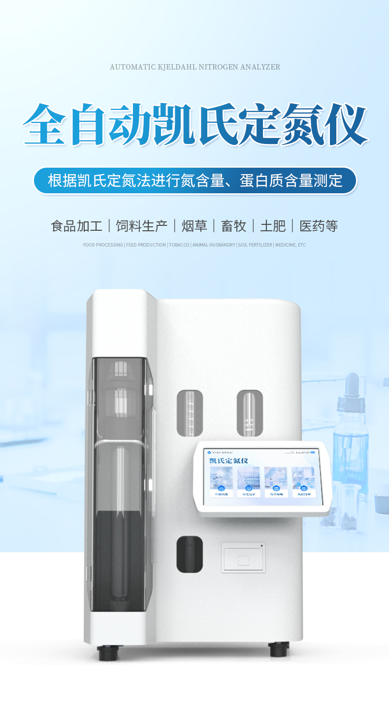 全自動凱氏定氮儀是根據凱氏定氮法進行氮含量、蛋白質含量測定的自動化儀器。可廣泛用于食品加工、飼料生產、煙草、畜牧、土肥、環境監測、醫藥、農業、科研、教學等領域氮及蛋白質的分析。