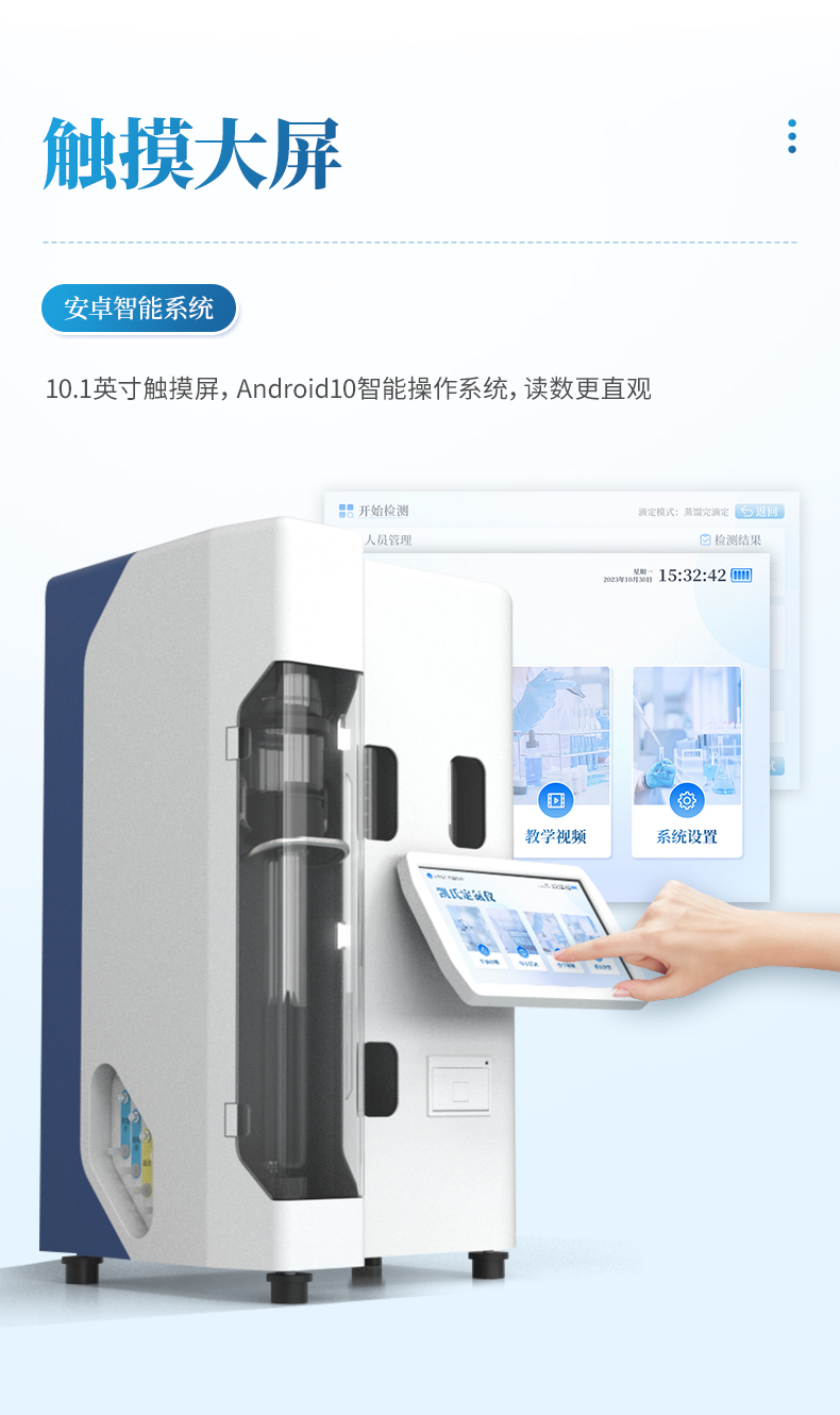 (2) 自動完成加堿、加硼酸、加稀釋液、加蒸餾水等加液步驟;自動完成蒸餾、吸收、滴定等操作步驟;滴定完成后反應杯自動排空和清洗。