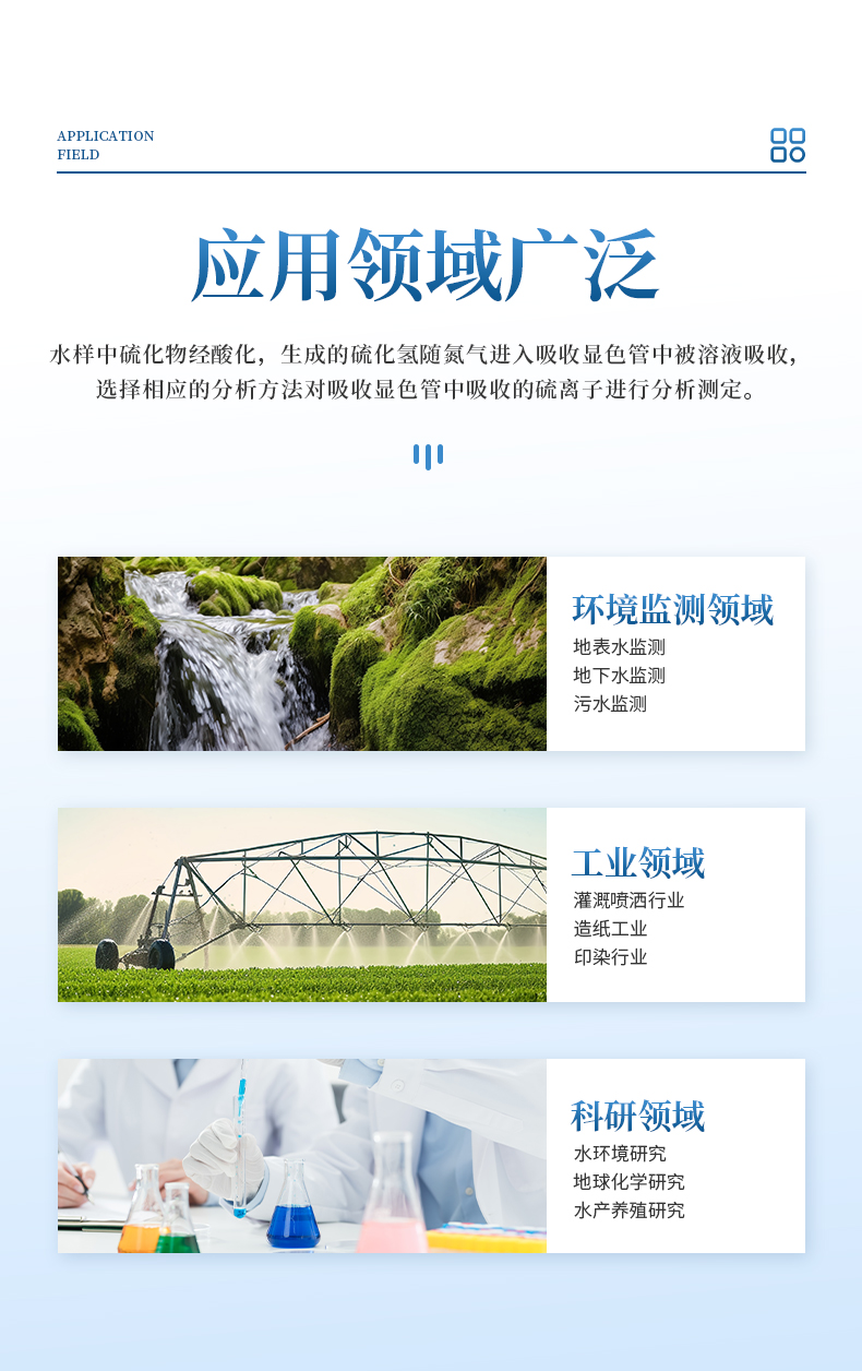 水樣中的硫化物經(jīng)酸化,生成的硫化氫隨載氣(氮?dú)猓┻M(jìn)入吸收瓶/吸收顯色管中被吸收溶液(乙酸鋅-乙酸鈉溶液或2%氫氧化鈉溶液)吸收,選擇相應(yīng)的分析方法對吸收瓶/吸收顯色管中吸收的硫離子進(jìn)行分析測定。