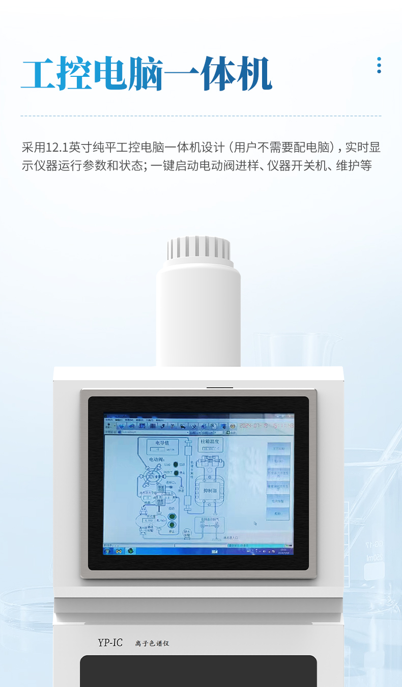 全新一代YP-IC+離子色譜儀,采用12.1吋純平工控電腦一體機設計(用戶不需要配電腦),實時顯示儀器運行參數和狀態;一鍵啟動電動閥進樣,一鍵完成儀器開關機、維護等操作,一鍵調閱儀器操作教程,方便快捷。