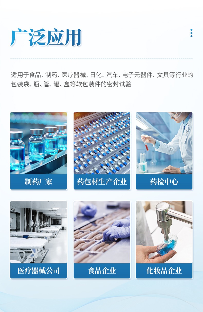 本產品適用于食品、制藥、醫療器械、日化、汽車、電子元器件、文具等行業的包裝袋、瓶、管、罐、盒等軟包裝件的密封試驗。通過試驗可以有效地比較和評價軟包裝件的密封工藝及密封性能,為確定相關的技術指標提供科學依據,也可進行經跌落、耐壓試驗后的試件的密封性能測試。
