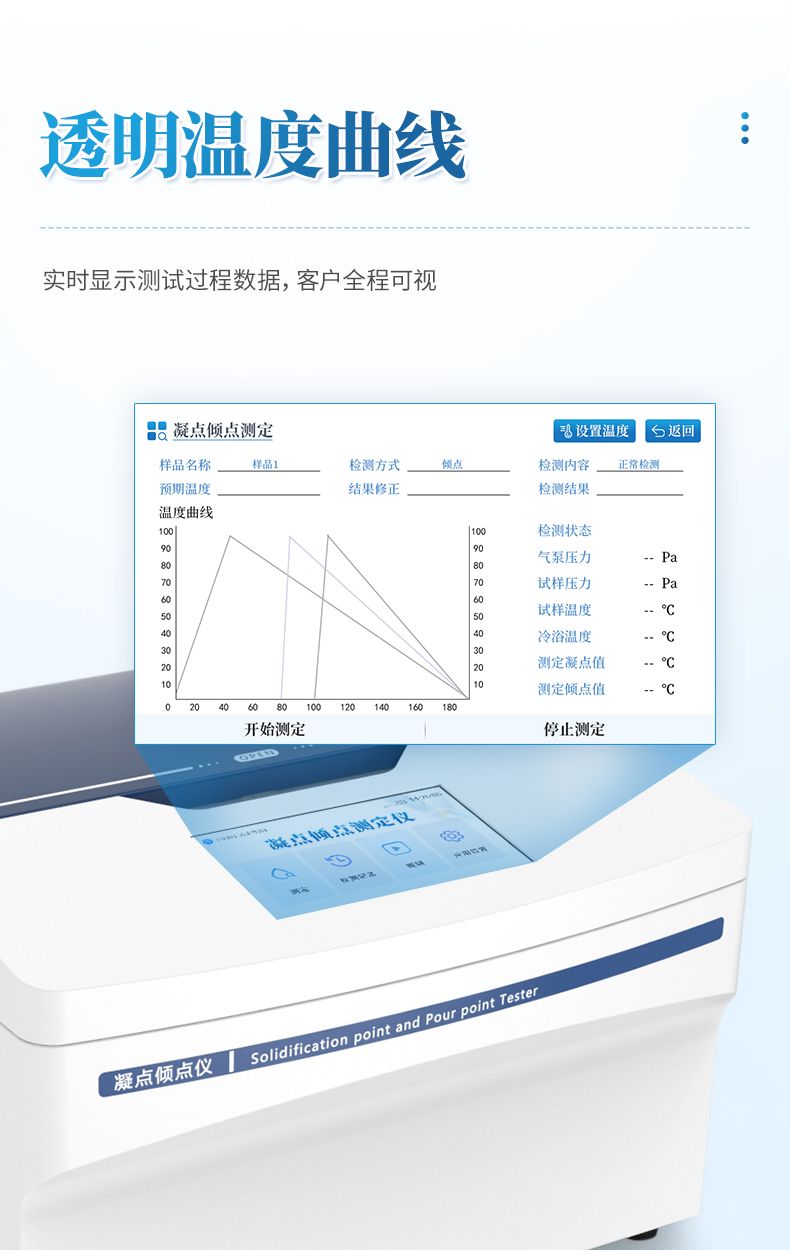 利用自動氣壓法,對樣品進行預熱(45℃或預期值+9℃)后,按照規定的降溫速率進行降溫。樣品溫度從預期值+15℃開始,每隔1℃自動加壓測試。實驗結果與GB/T 510、ISO3016和ASTM D97所描述的傾斜法完全一致。