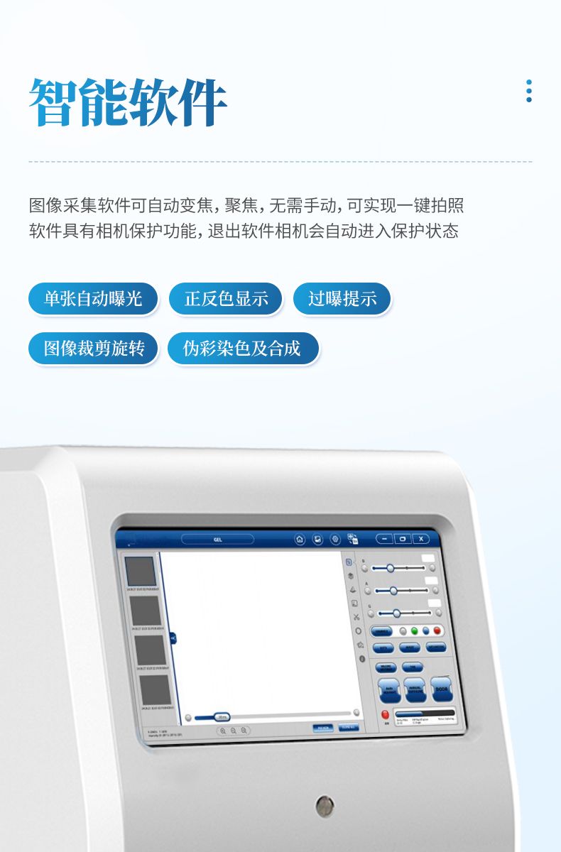 采用 13.3 寸觸摸屏控制,內存 16G,256G 固態硬盤,使儀器具有更強大圖像計算及 處理能力,配合圖像采集軟件操作簡捷直觀,軟件具有自動采集信號,并進行自己處理合 成功能;曝光模式分為自動曝光、手動曝光、以及自動定義曝光功能。配合圖像分析軟件 可對圖像信號進行定性定量分析。