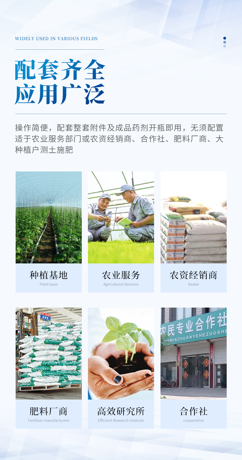 配套齊全:該儀器無需用戶自配附件,相當于一個小型實驗室。適于農業服務部門或農資經銷商、合作社、肥料廠商、大種植戶測土施肥。