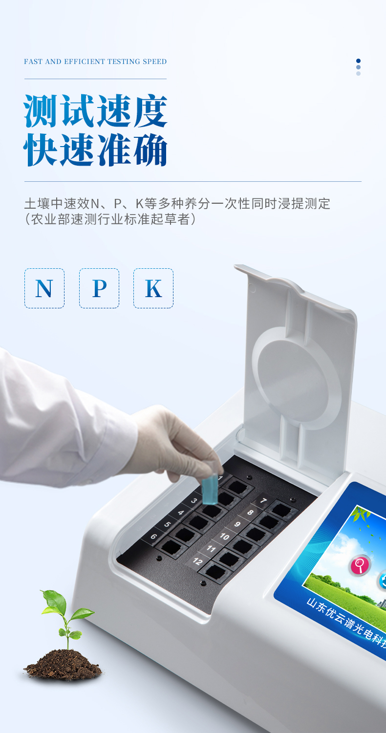 測試速度:正常熟練程度下,測一個土壤樣品(N、P、K)三項需要20分鐘(含藥劑準備及土樣前處理時間),同時檢測三個土壤樣品(N、P、K)≤40分鐘,同時測8個土樣≤1小時。
