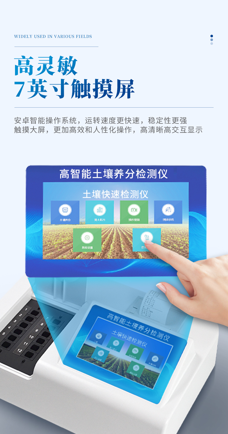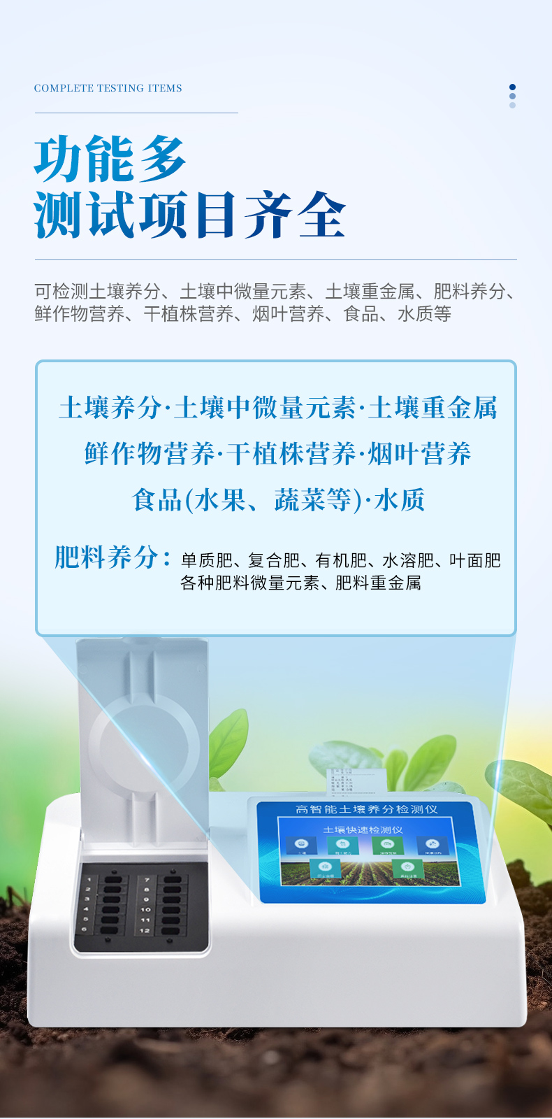 配套齊全:該儀器無需用戶自配附件,相當于一個小型實驗室。適于農業服務部門或農資經銷商、合作社、肥料廠商、大種植戶測土施肥和鑒別肥料真假。
