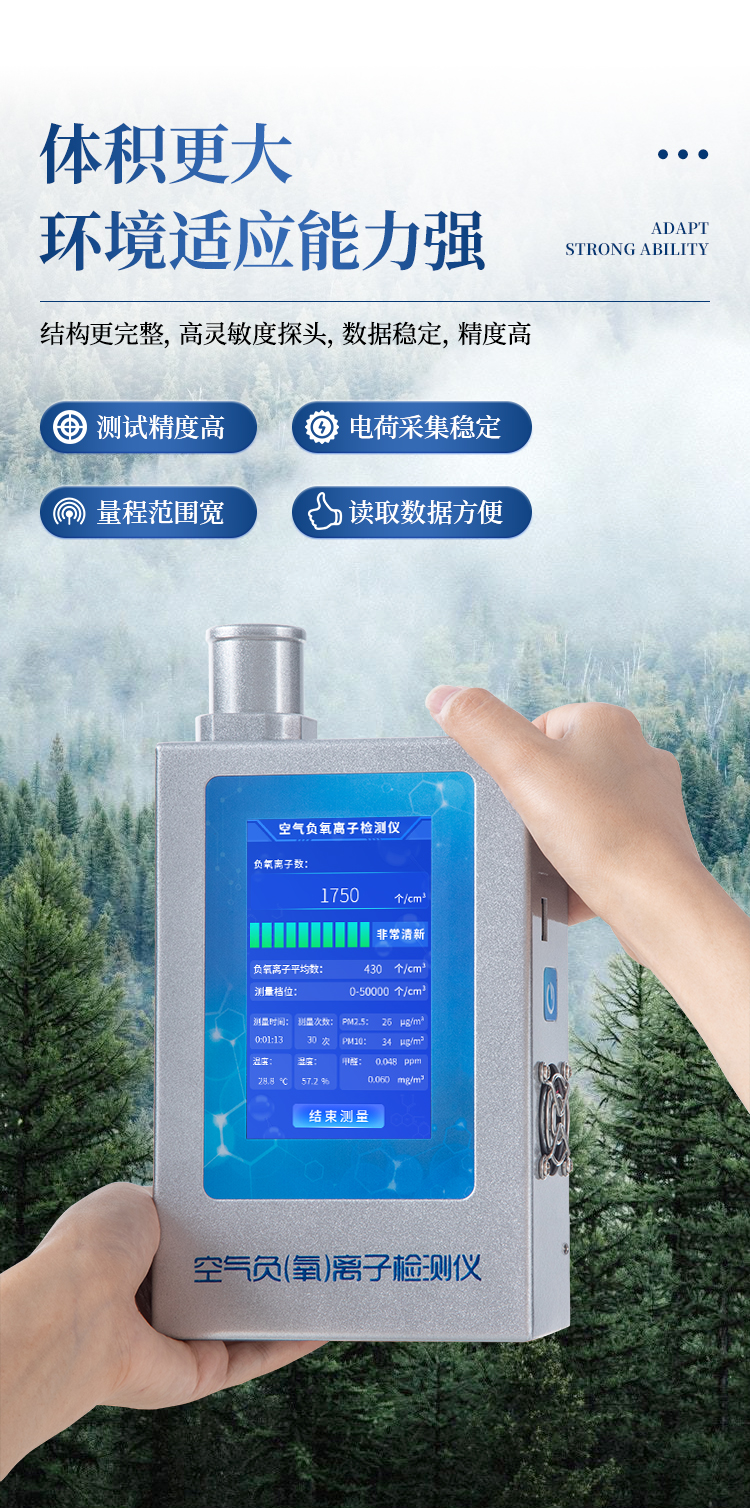 FY2 型便攜式負離子檢測儀是一款高精度、專業型空氣負離子、甲醛檢測分析儀器。采用先進的圓筒電容結構負(氧)離子捕獲機制,將大氣中所含有負(氧)離子捕獲,然后通過獨有算法,進行精確統計計算。具備測量過程穩定,反應迅速,測量結果準確等優點。同時具備很強的抗電磁、靜電、電磁波干擾能力,對小粒徑負離子有極佳的敏感性和捕捉能力,整體性能優越。