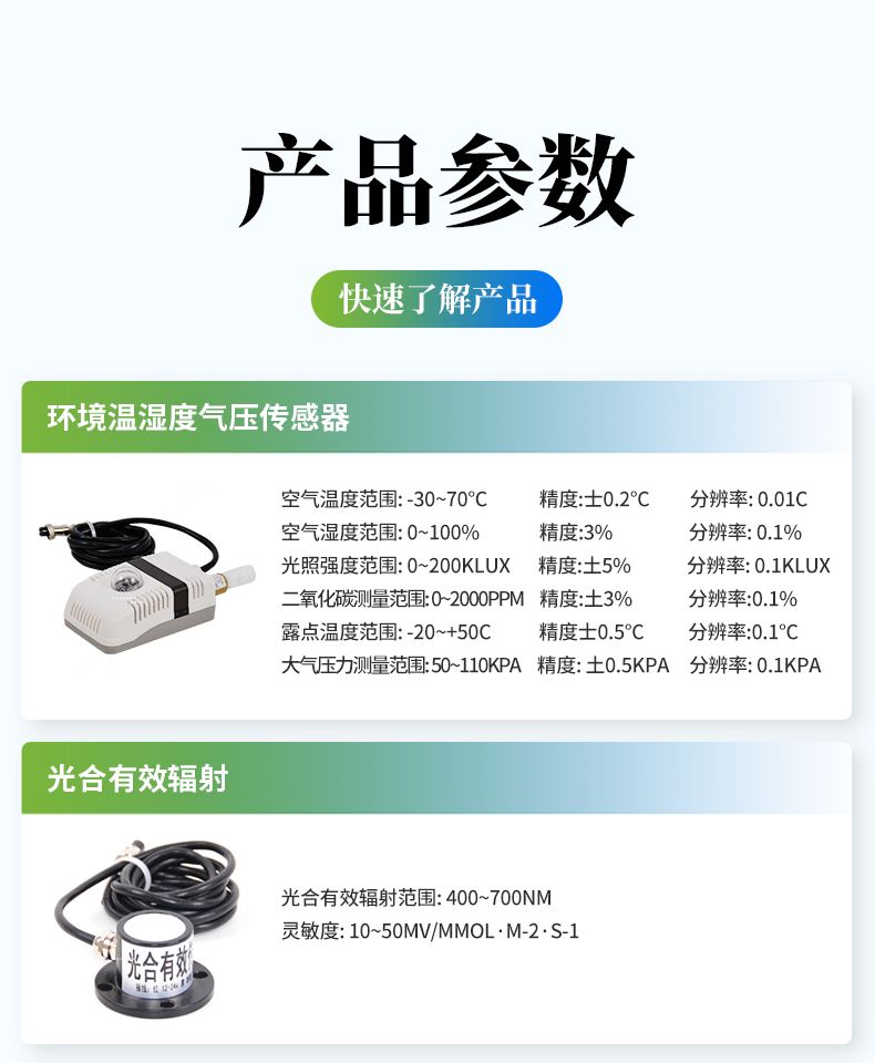 手持式智能農業氣象環境檢測儀是我們專門針對農田、草場局部小尺度環境設計的,對與植被和農作物生長密切相關的土壤、水氣等環境參數監測的農田小氣候站。它主要觀測與農業相關的空氣溫度、空氣濕度、光照強度、二氧化碳濃度、露點溫度、光合有效輻射、土壤溫度、土壤水分、土壤鹽分、土壤PH、風速、風向、降雨量、大氣壓力、總輻射、葉面溫度等16個環境參數氣象要素,為農業科研、農業生產等提供良好的支持。