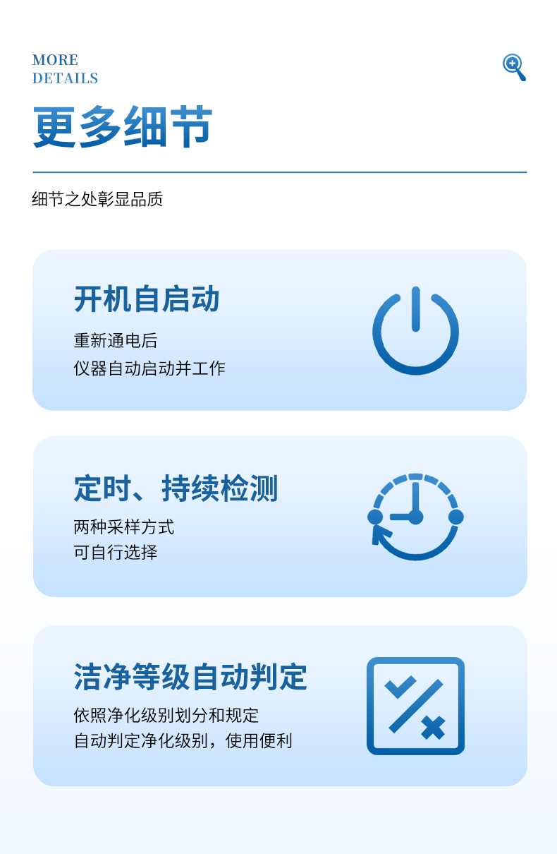 5、依照凈化級(jí)別劃分和規(guī)定,自動(dòng)判定凈化級(jí)別,使用便利。