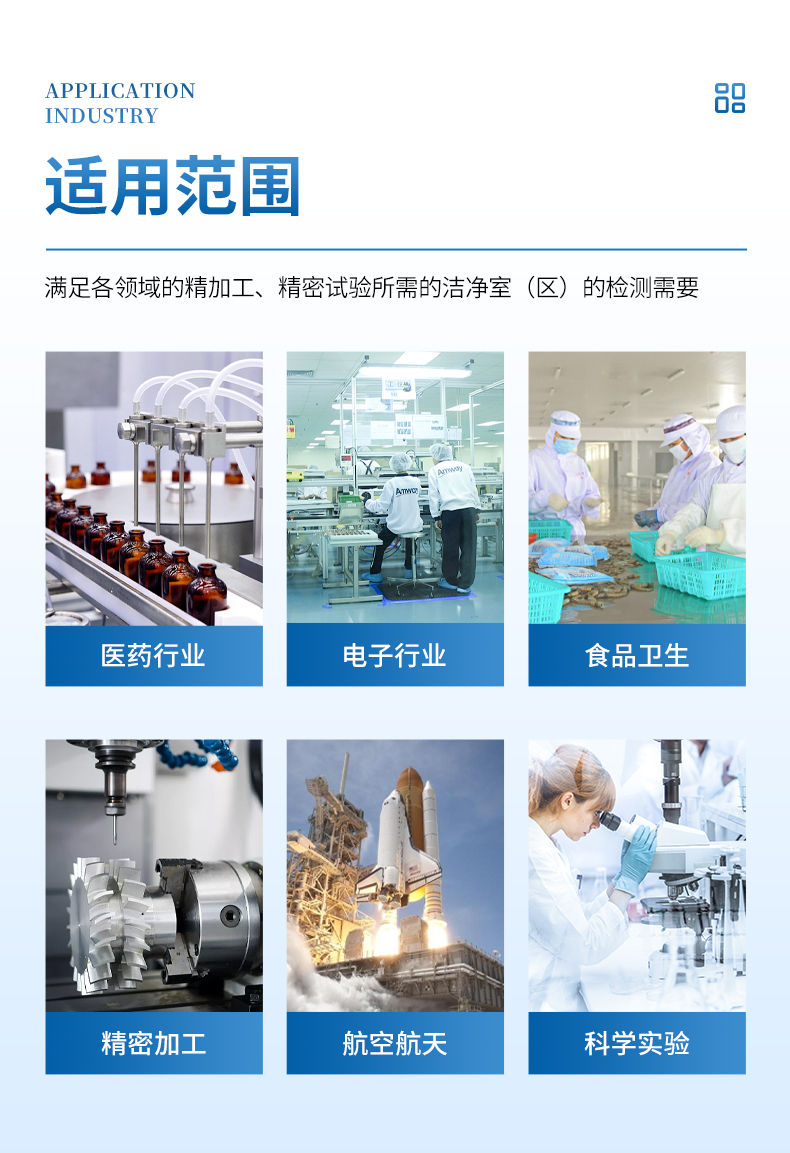 滿足醫(yī)藥行業(yè)(制藥廠、藥檢所、醫(yī)院等);電子行業(yè)(半導(dǎo)體工廠、精密機(jī)械的生產(chǎn)加工等);食品衛(wèi)生行業(yè)(乳制品、塑封肉食品、調(diào)味食品、農(nóng)產(chǎn)品等的精加工);過(guò)濾器的生產(chǎn)廠家(檢驗(yàn)過(guò)濾器的質(zhì)量及效率等);光學(xué)及航空航天等領(lǐng)域的精加工、精密試驗(yàn)、生物工程等所需的潔凈室(區(qū))的檢測(cè)需要。