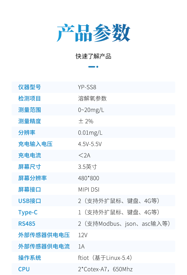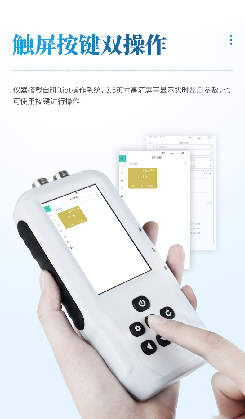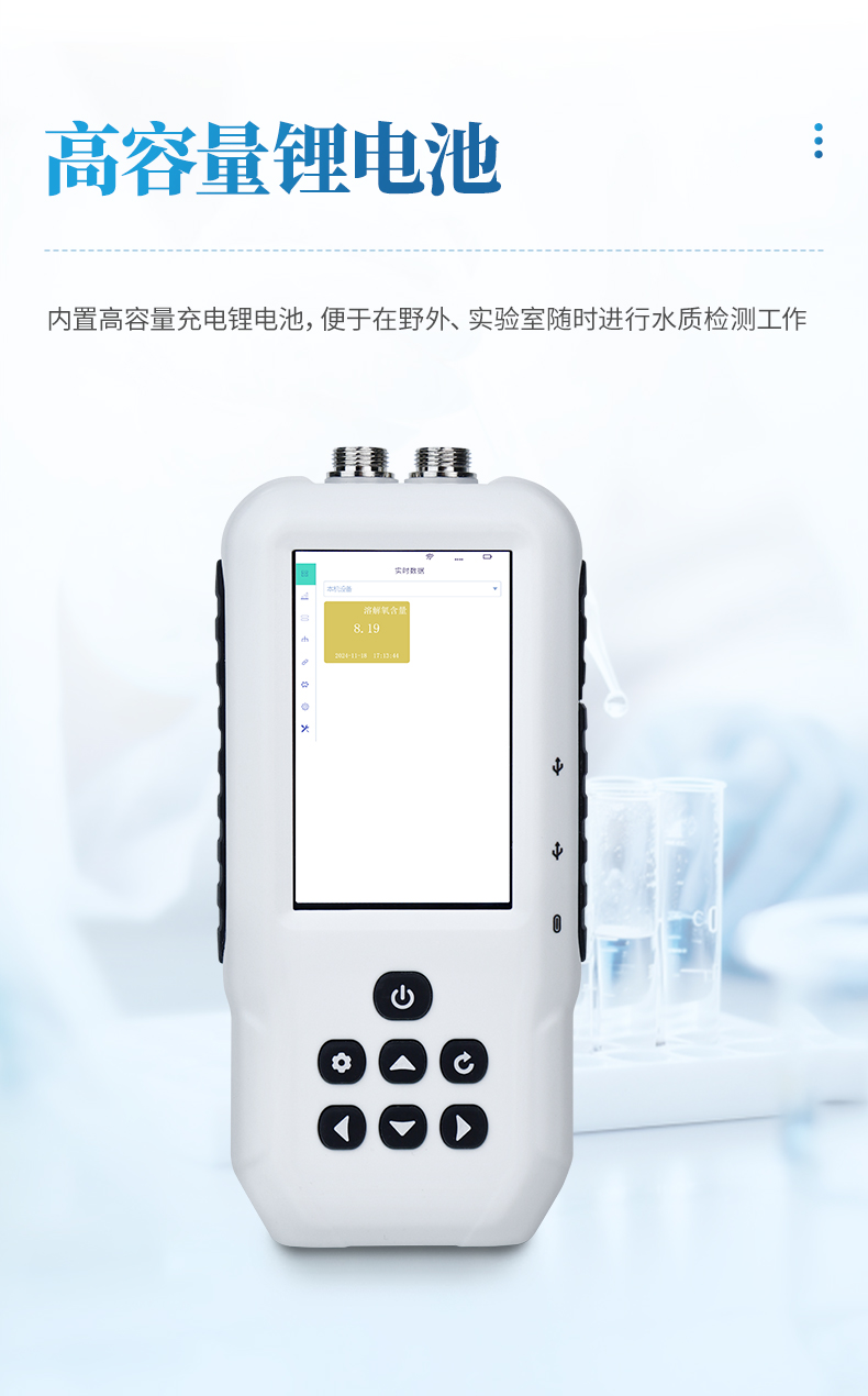 SS8型號便攜式多參數水質測定儀是一款電極法水質分析儀器,采用全數字電極檢測,可檢測溶解氧參數。儀器搭載自研ftiot操作系統,操作簡單、性能穩定、測量準確、檢測范圍廣,內置高容量充電鋰電池,便于用戶在野外、實驗室隨時進行水質檢測工作。