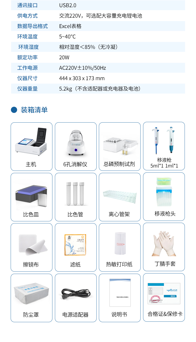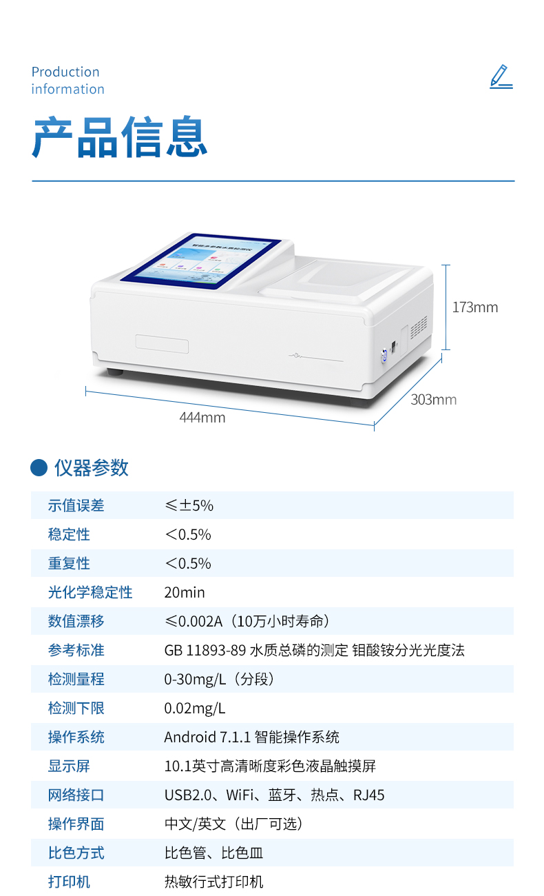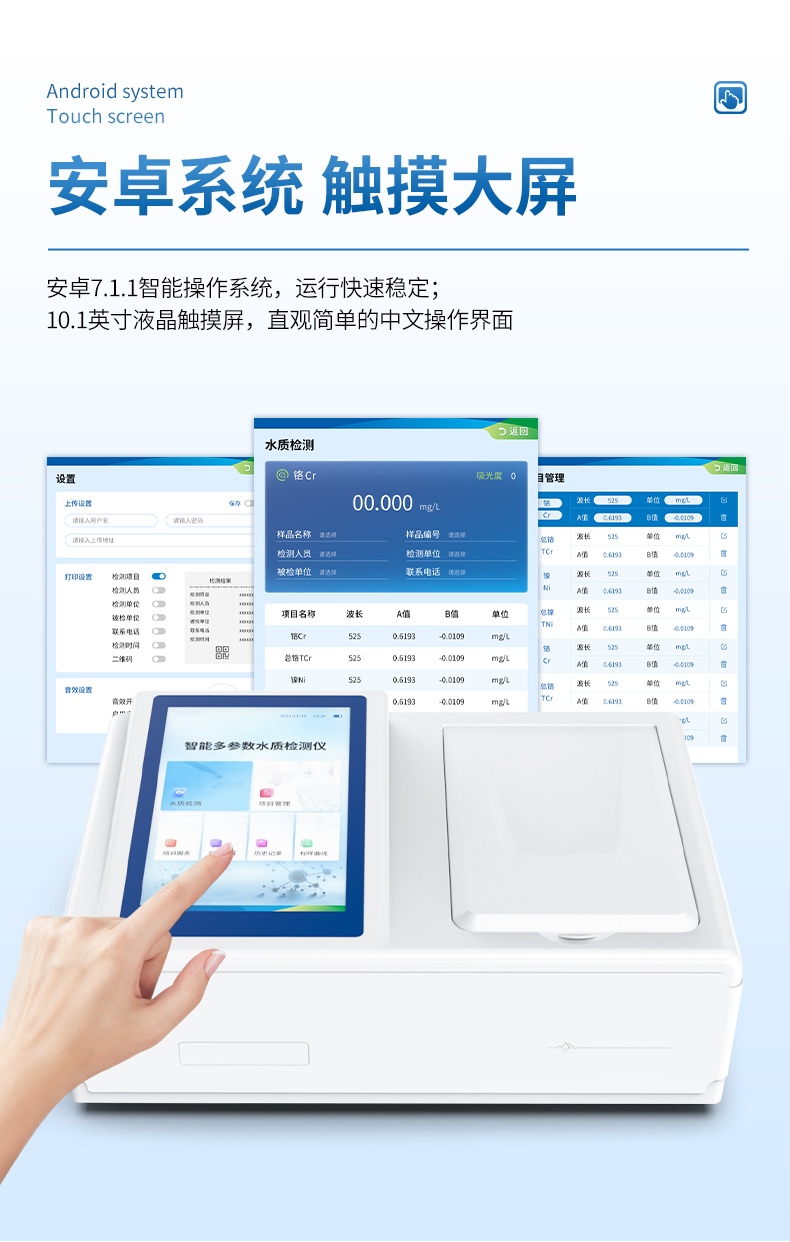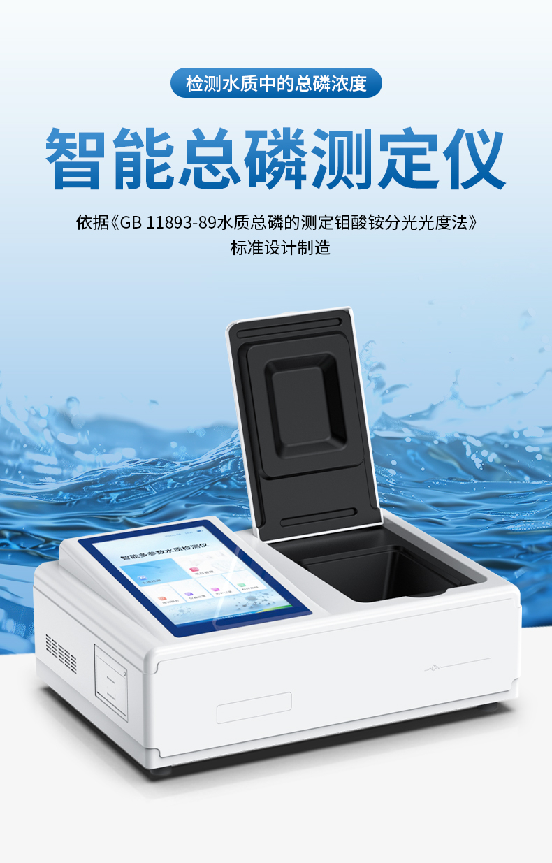 智能總磷測定儀是參考《GB 11893-89 水質總磷的測定 鉬酸銨分光光度法》標準設計制造,主要檢測水質總磷濃度指標;本儀器兼具智能數據分析功能,圖表、列表顯示數據,分析一目了然;高清晰度彩色液晶觸摸顯示屏,Android智能操作系統,中文顯示界面,中英文鍵盤,人性化操作,使用更簡單。