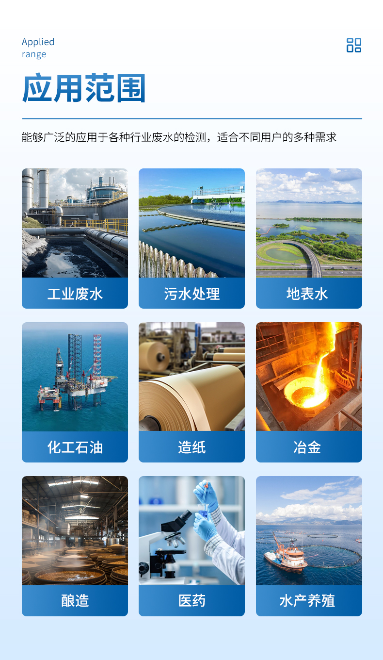 能夠廣泛的應用于各種行業(工業廢水、城市污水、生活污水及江湖流域地表水)廢水的檢測,可適合不同用戶的多種需求,可在化工、石油、焦化、造紙、冶金、釀造、醫藥等工業廢水及各種生活污水監測應用。