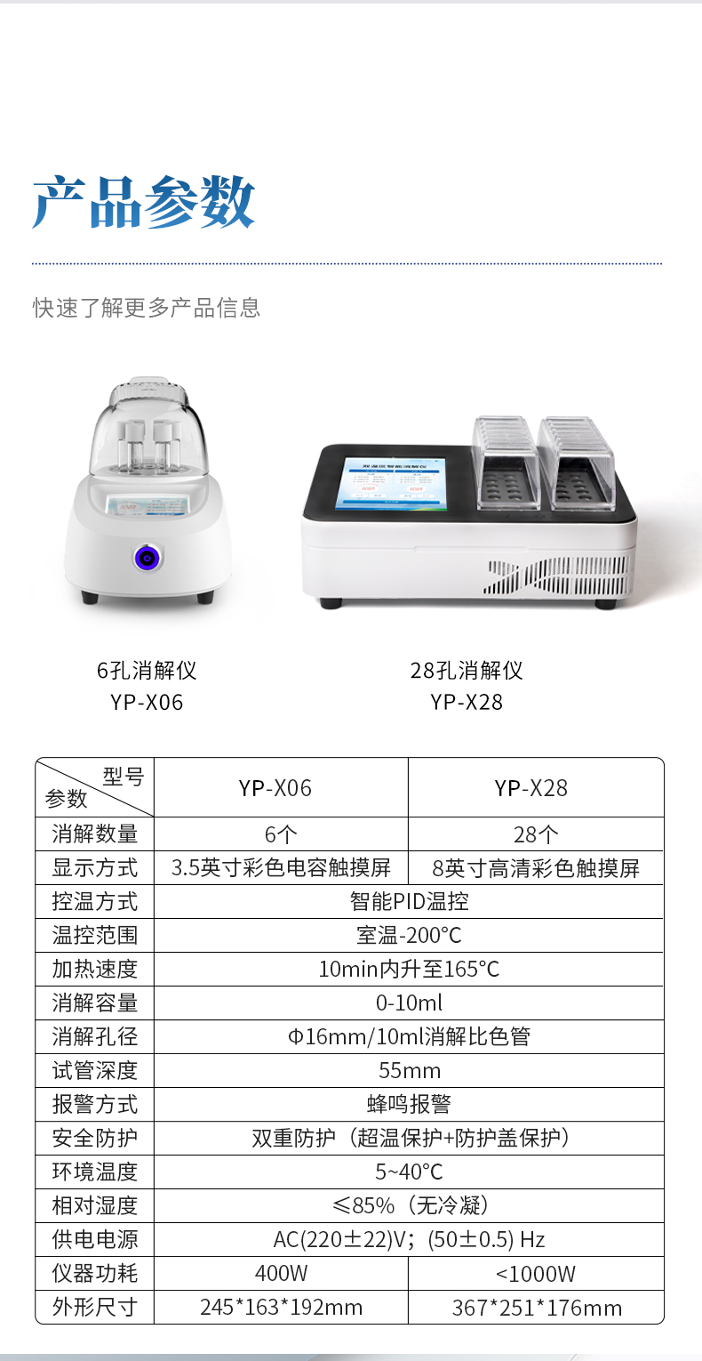 YP-X06型便攜式智能消解儀是一款依據(jù)環(huán)保行業(yè)標準《HJ/T399-2007》研發(fā)的新款多功能快速消解儀,搭載3.5寸電容觸屏操作,智能安全,升溫速度快,溫度均勻穩(wěn)定,可對多種檢測參數(shù)如:COD、總磷、總氮等項目進行一鍵消解。