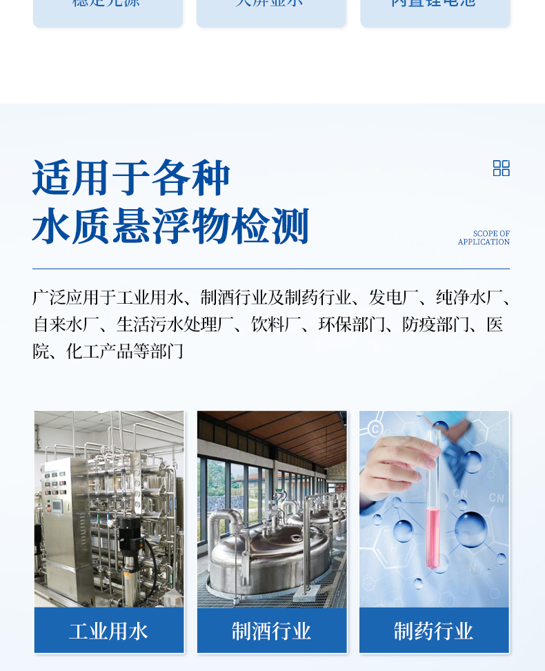 可以廣泛應(yīng)用于發(fā)電廠、純凈水廠、自來水廠、生活污水處理廠、飲料廠、環(huán)保部門、工業(yè)用水、制酒行業(yè)及制藥行業(yè)、防疫部門、醫(yī)院、化工產(chǎn)品等部門的濁度測量.