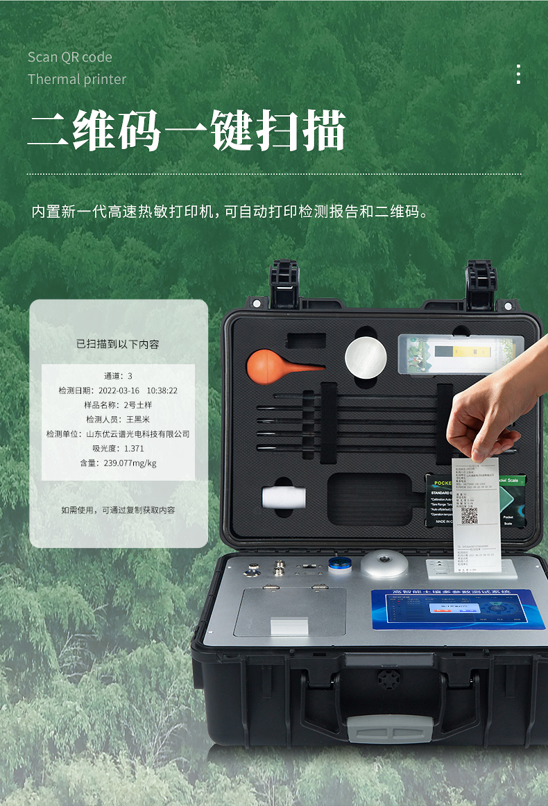 21、內置新一代高速熱敏打印機(無需色帶),打印內容包含:檢測單位、檢測人員、檢測項目、通道號、吸光度、養分含量(mg/kg)、檢測時間、以及二維碼等信息