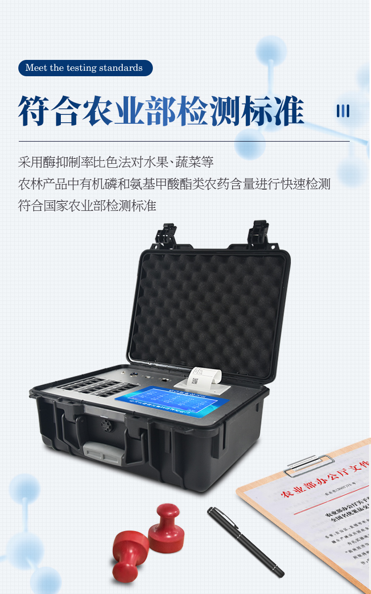 廣泛應用于主要用于蔬菜、水果、茶葉、糧食、農副產品等食品中有機磷和氨基甲酸酯類農藥殘留的快速檢測;此外還可用于果蔬茶生產基地和農貿批發銷售市場現場檢測,餐館、學校、食堂、家庭果蔬加工前的安全速測等。