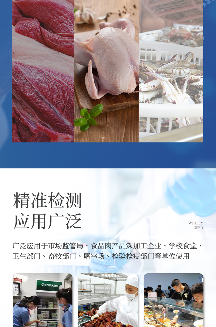 該多功能食品安全檢測儀為集成一體化食品安全快速檢測分析設(shè)備,廣泛應(yīng)用于市場監(jiān)管局、食品肉產(chǎn)品深加工企業(yè)、學(xué)校食堂、衛(wèi)生部門、畜牧部門、屠宰場、檢驗(yàn)檢疫部門等單位使用。
