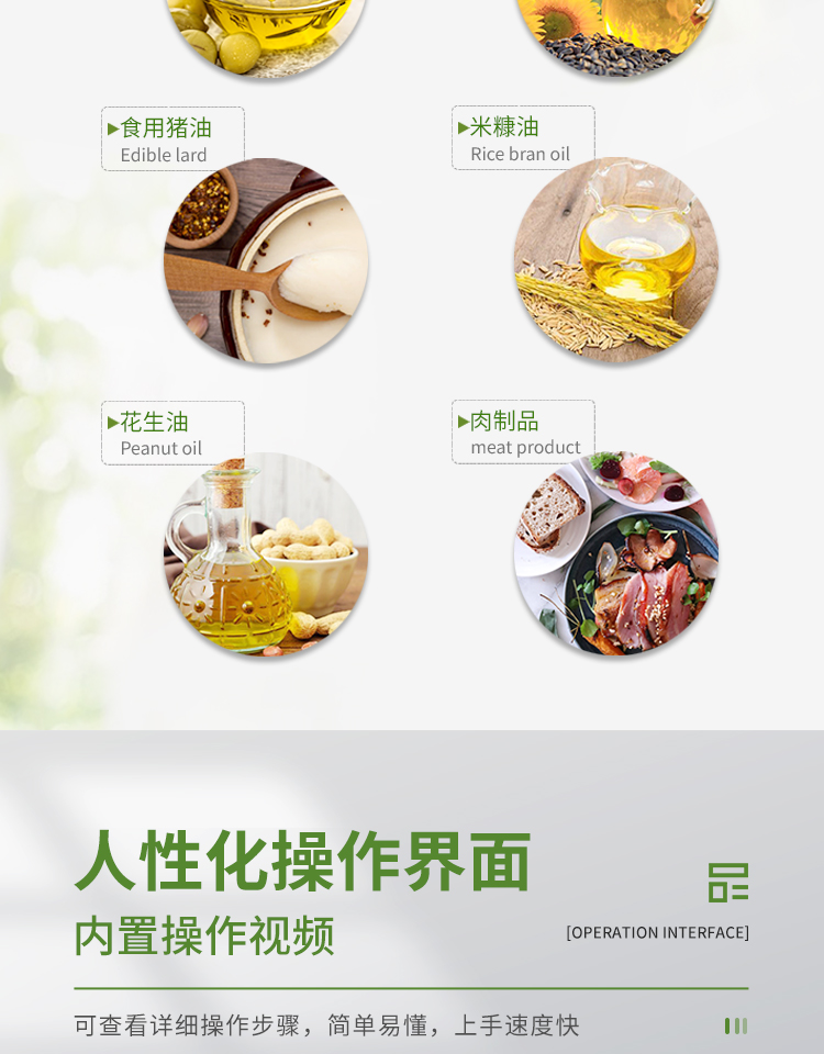 食用油過氧化值檢測儀為集成化油品快速檢測分析設(shè)備,能夠快速檢測食用植物油、食用豬油、花生油、葵花油、米糠油、食品、肉制品中的過氧化值含量;通過檢測可確定植物油是否符合國家標(biāo)準(zhǔn)或是否為劣質(zhì)油、地溝油等。儀器預(yù)留其他項目檢測程序和端口,根據(jù)日后需求可方便的自主增加檢測項目。日后可升級為檢測水產(chǎn)品、面制品的綜合類型儀器。