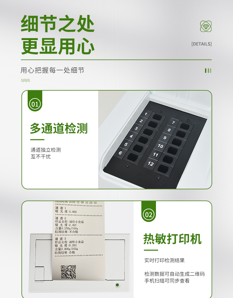 6、配備新一代嵌入式熱敏打印機,可選擇手動打印或者自動打印,檢測完成可自動打印檢測報告和二維碼。