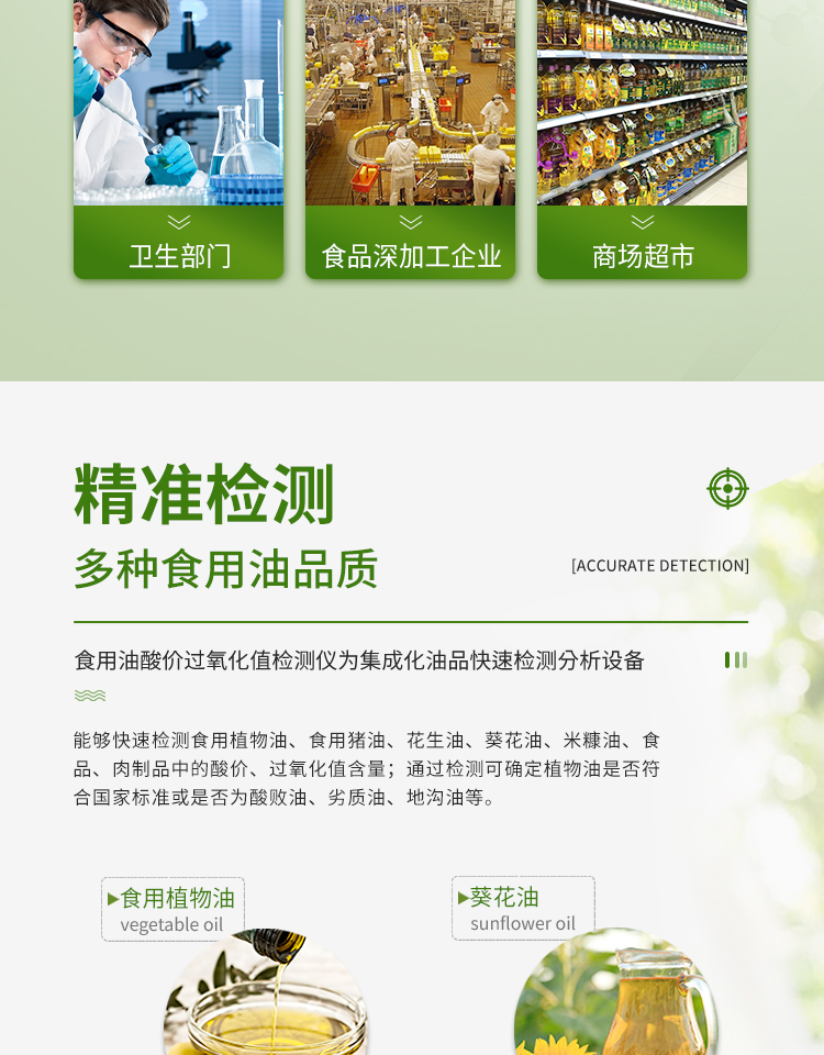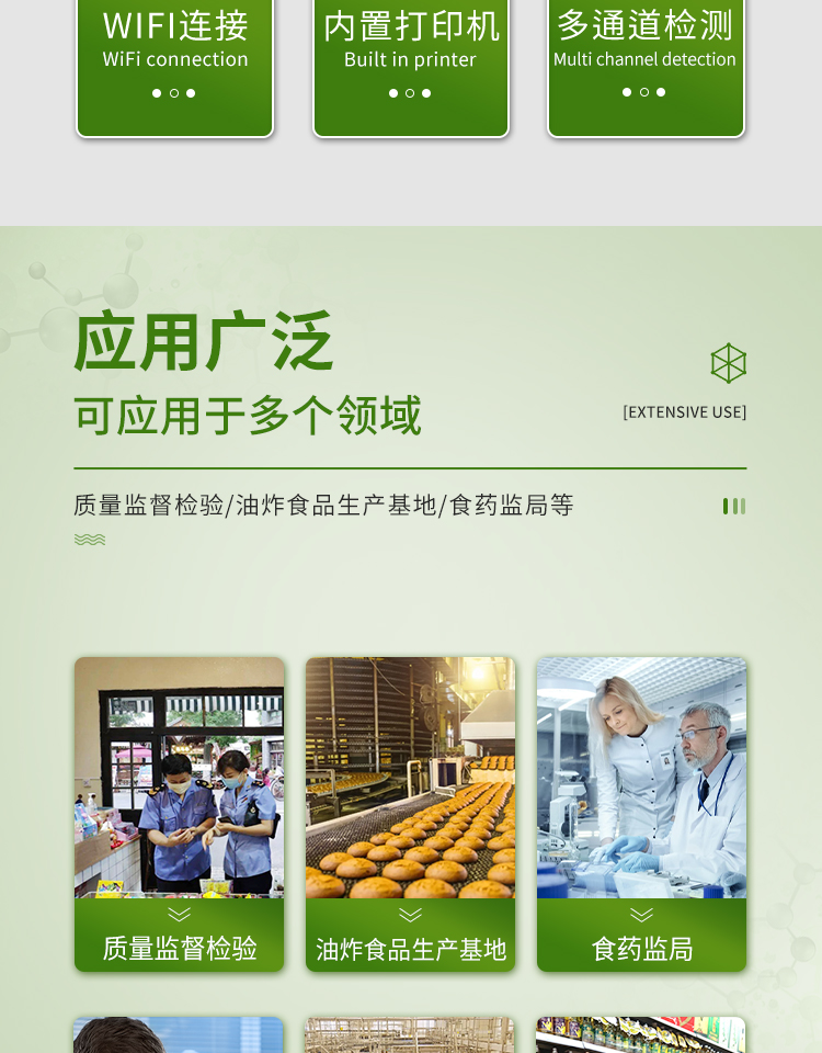廣泛應用于質量監督檢驗、工商管理、油炸食品生產基地、食藥監局、衛生部門、肉制品食品深加工企業、商場超市、各大食品安全監測系統等單位使用。